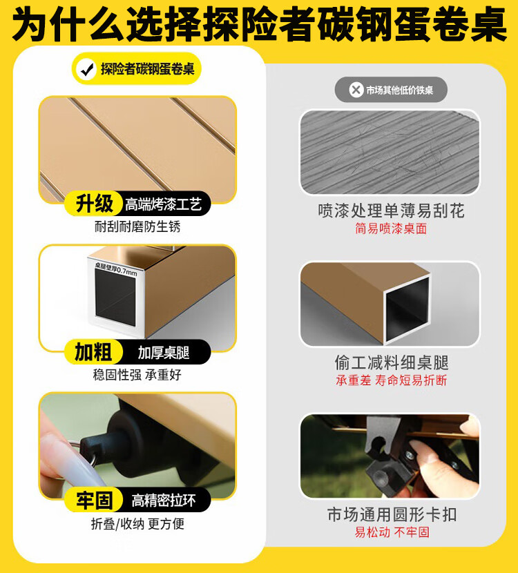 这个蛋卷桌实在是太结实了,比我想象的质量好很多,而且两头的固定扣弹性也很好,收纳起来体积。很小,很适合户外出行