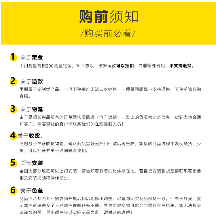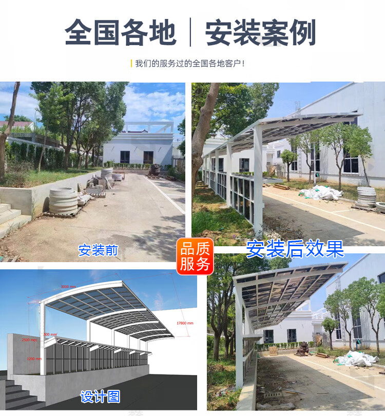 客服服务态度好,有问必答,本来想着包安装的,客服小陈的耐心解答让我打消了疑虑,最终选择自己安装,安装过程中遇到任何问题小陈都能及时回复,碰到一些关键点还远程视频讲解,车棚的质量没得说,用卡尺卡过,厚度尺寸精准,对比相同价钱的雨棚,这家的用料都会厚个几㎜,建议有一定动手能力的可以尝试自己安装,虽然有点累,但是成就感拉满