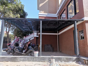 单边吊拉车棚安装完工。质量好,样式时尚,新颖,领导满意。
