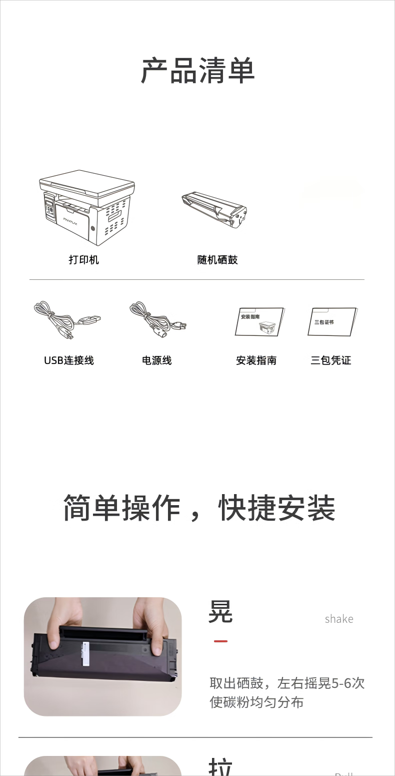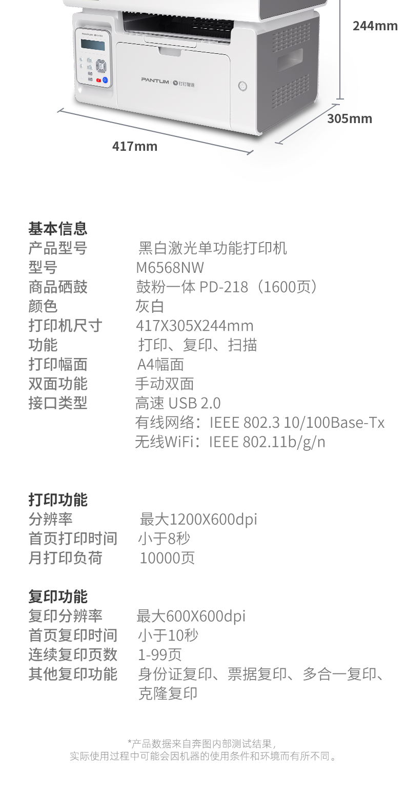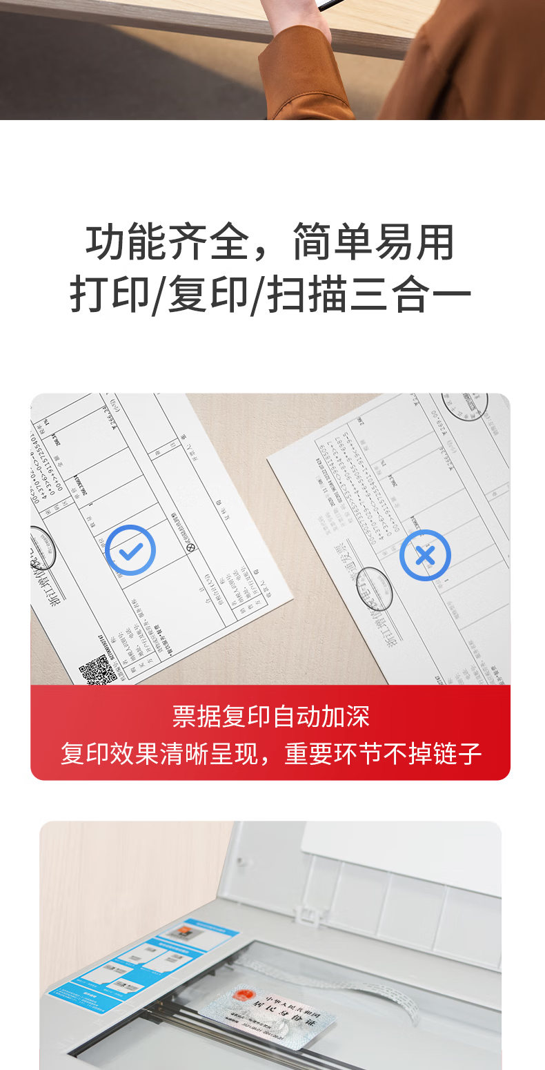 今天刚收到,安装方便,打印非常清晰,也可以手动双面,支持电脑平板手机多种打印方式,真不错,复印,扫描没使用不评价,后悔以前老用墨盒的,喷墨老出问题,推荐买激光打印机