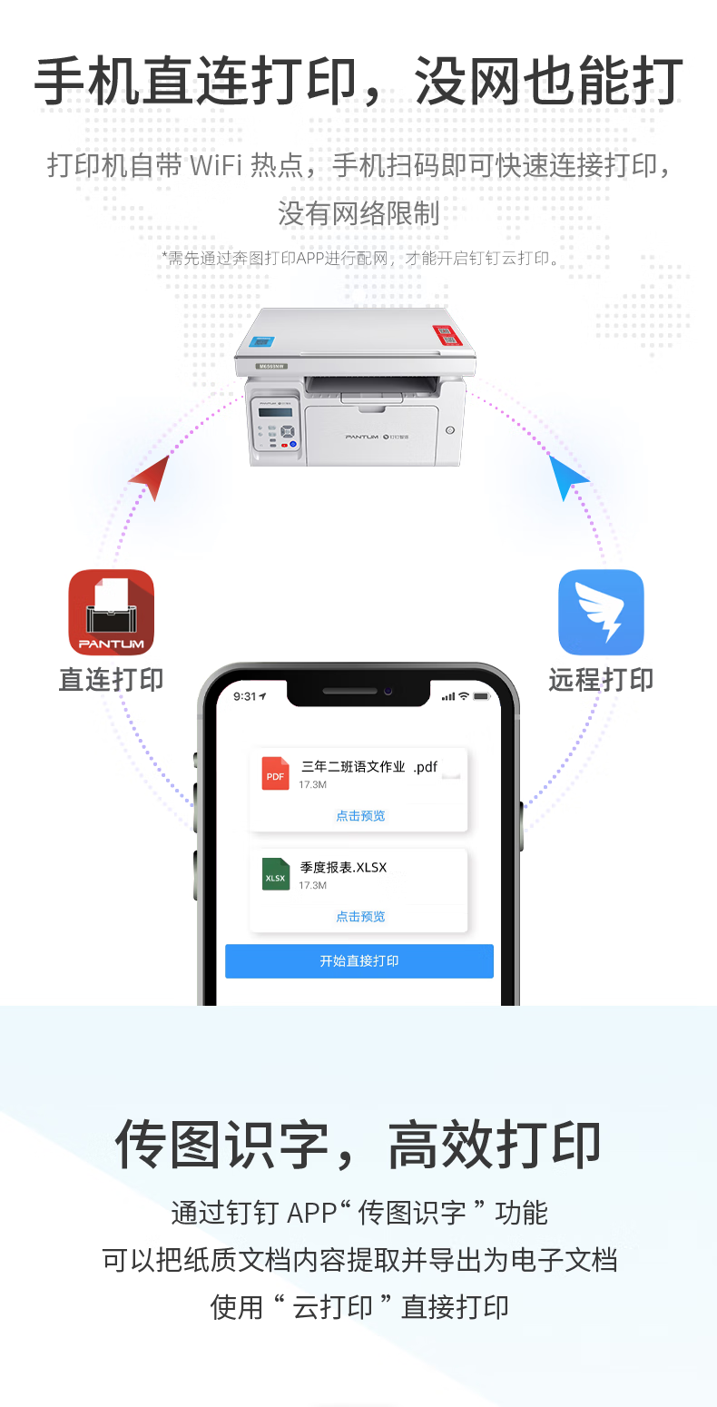 奔图(PANTUM)A4黑白激光打印机打印复印扫描多功能一体机商用办公家用打印机 M6518NW有线网络/手机远程打印 标配全新机器含硒鼓 套餐可加粉