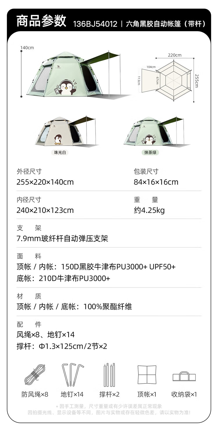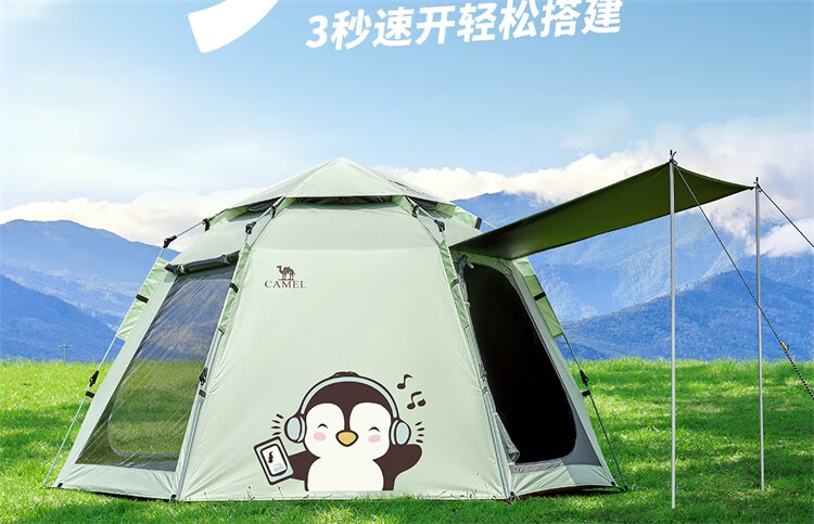 骆驼抱抱鹅六角黑胶户外露营公园野营自动速开帐篷2025新品 黑胶天幕帐篷,珠光白,136BJ54011