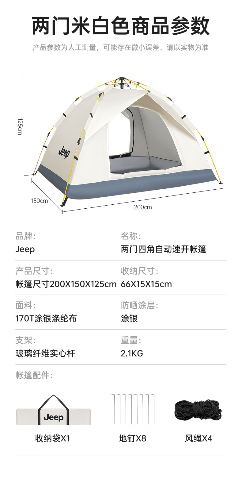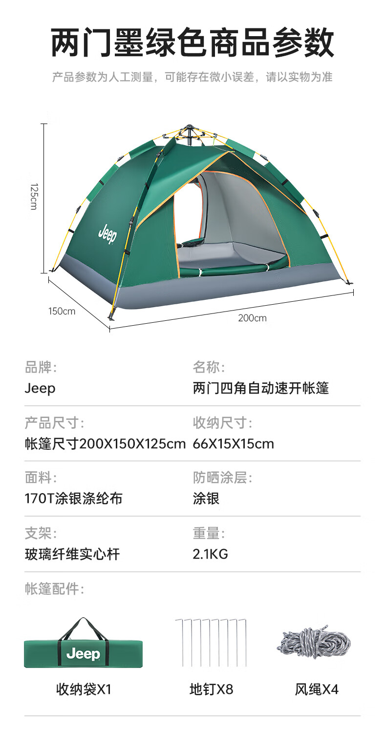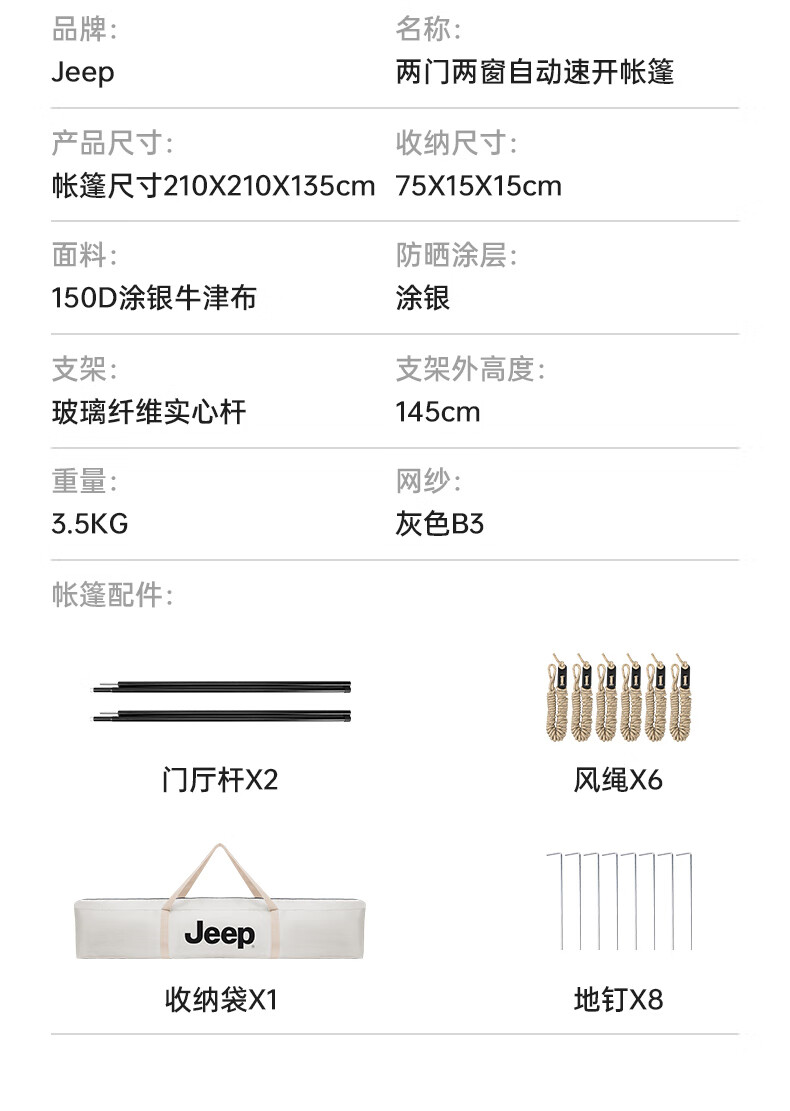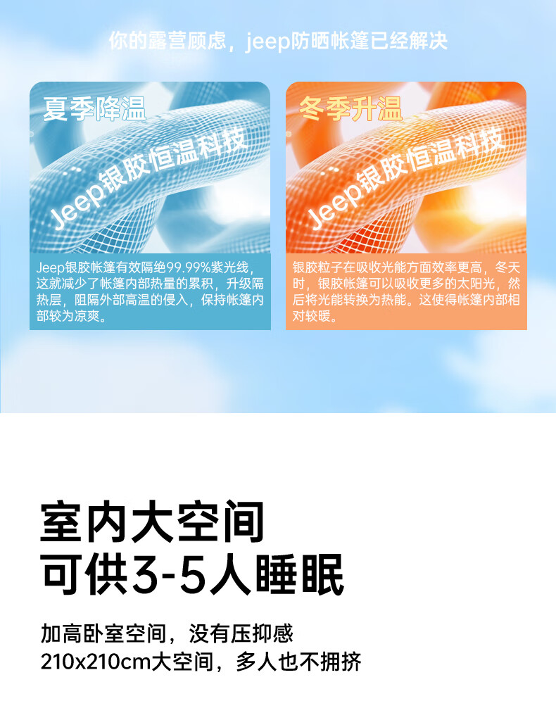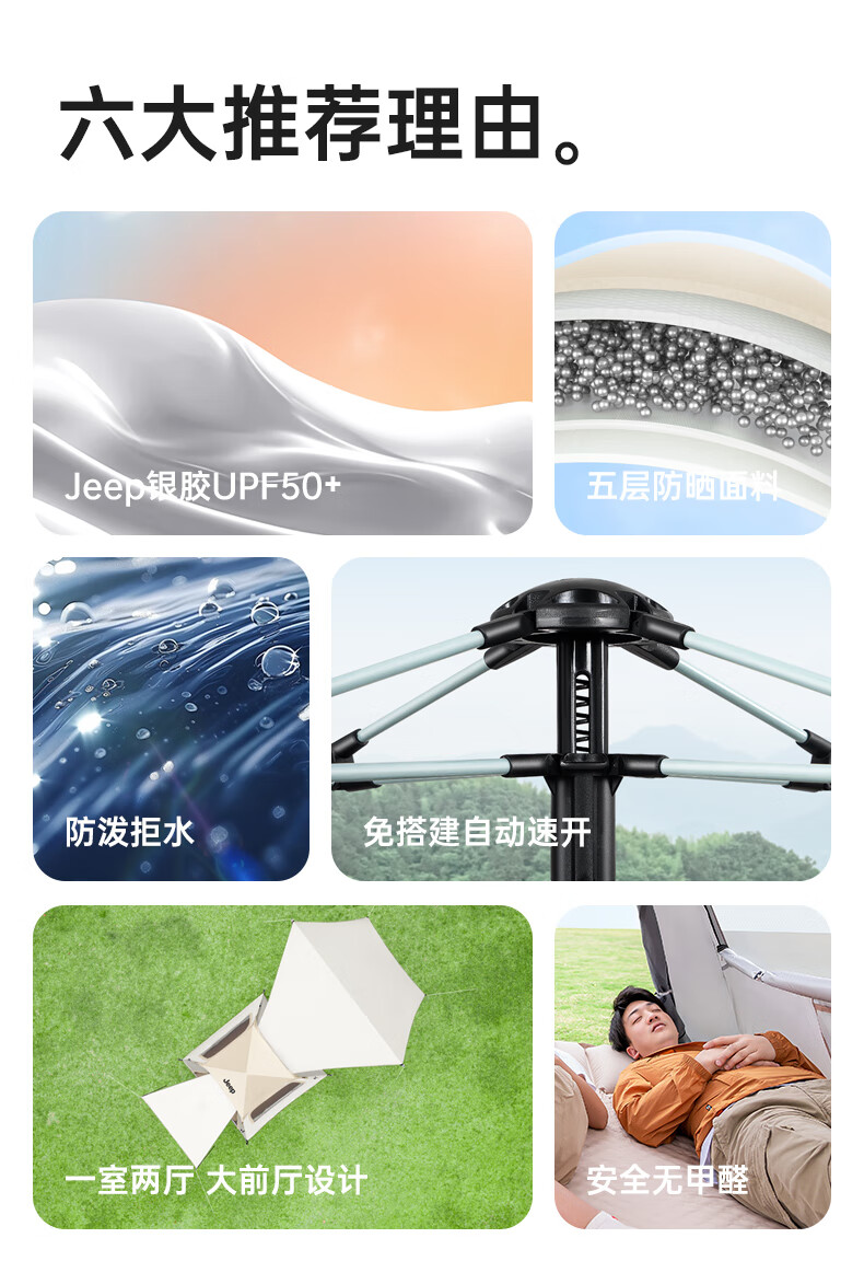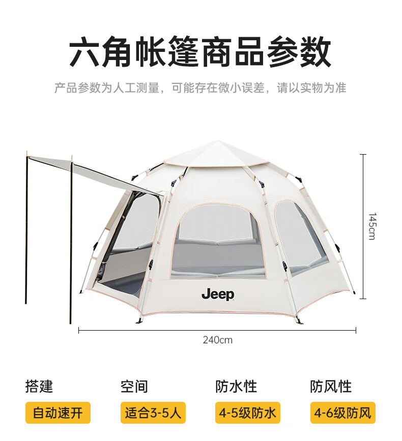 JEEP天幕帐篷户外露营帐篷全自动便捷速开天幕二合一防晒家庭野营装备 涂银天幕帐篷两门两窗+防潮垫