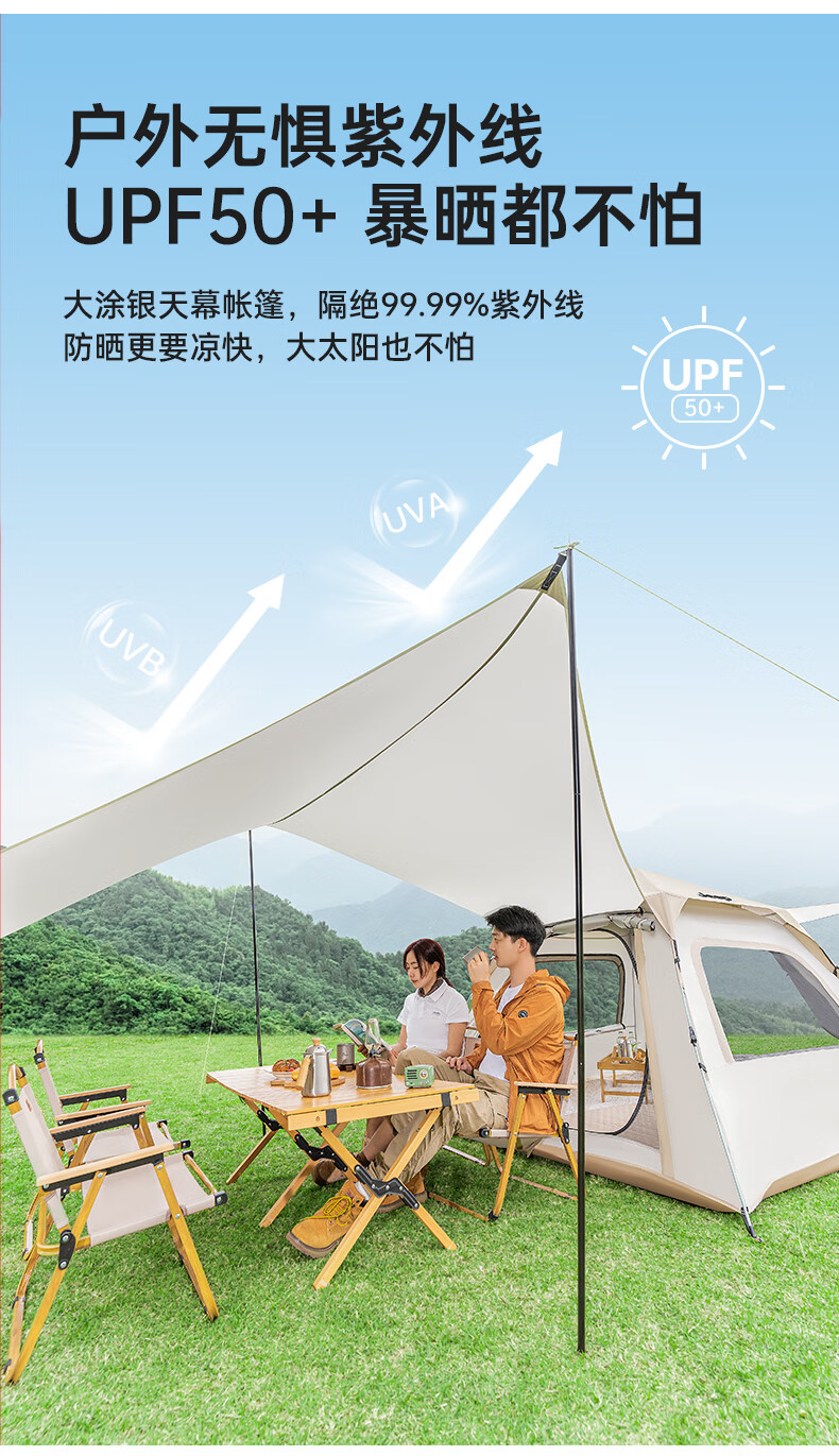 帐篷小巧,天幕也是,帐篷搭建容易,收纳需要练习,在海边支杆会弯但不会断。售后服务以忽悠和骗为主,本身送的风绳就不好,答应再送也没送。配件地钉和风绳最后单买的,送的真不行。反正便宜,一分钱一分货,200多不可能比400多好,使用频率一般还是挺推荐的,6级风试过了,天幕与门拉锁会开不会破裂,不迎风就可以了
