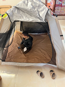 买了准备五一出门用的,出门失败,在家打开玩了。大小还是足够一家四口躺跟玩了。客厅不够大,天幕没有装,也没固定,就打开让小孩在里面玩了