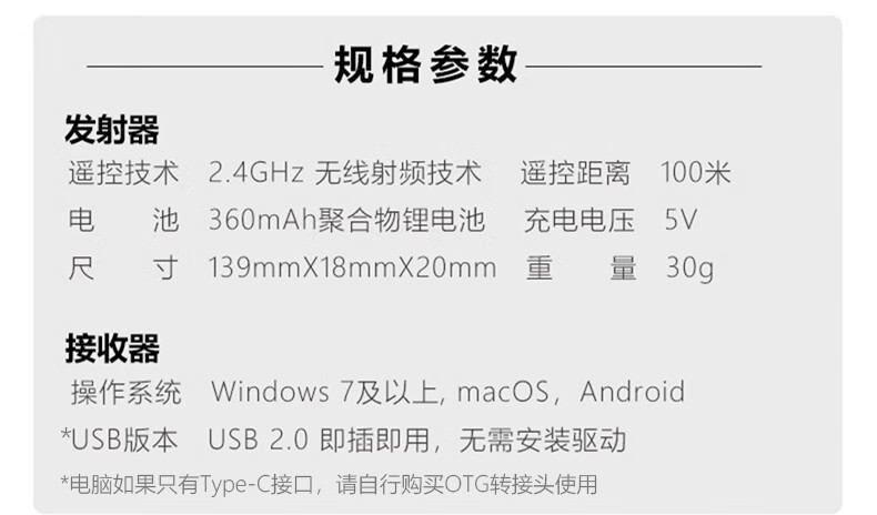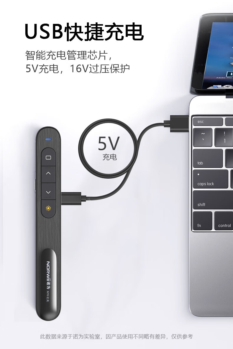 诺为翻页笔(尾部有接收器) × 1 说明书保修卡 × 1 USB充电线 × 1 绒布收纳袋 × 1 品牌包装盒× 1
