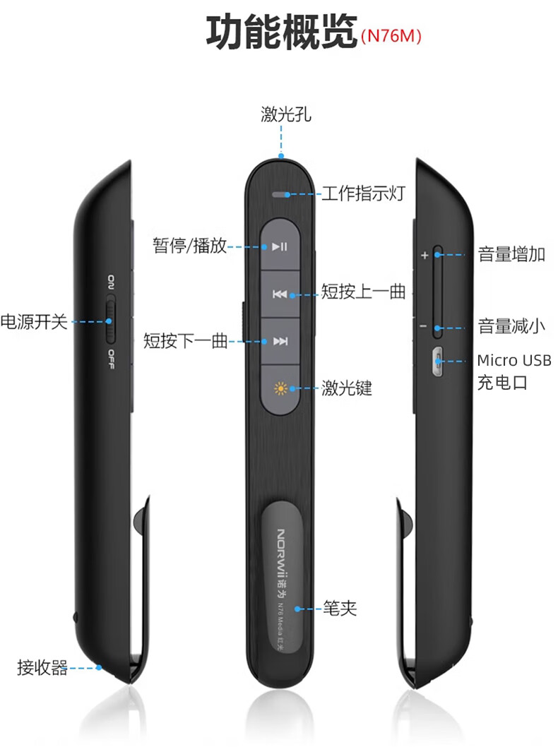 诺为(KNORVAY)N76M 司仪宝婚礼主持人音控笔上下曲切换音量大小调节播放暂停无线遥控笔USB充电可控播放器 N76m 婚庆司仪宝黑色