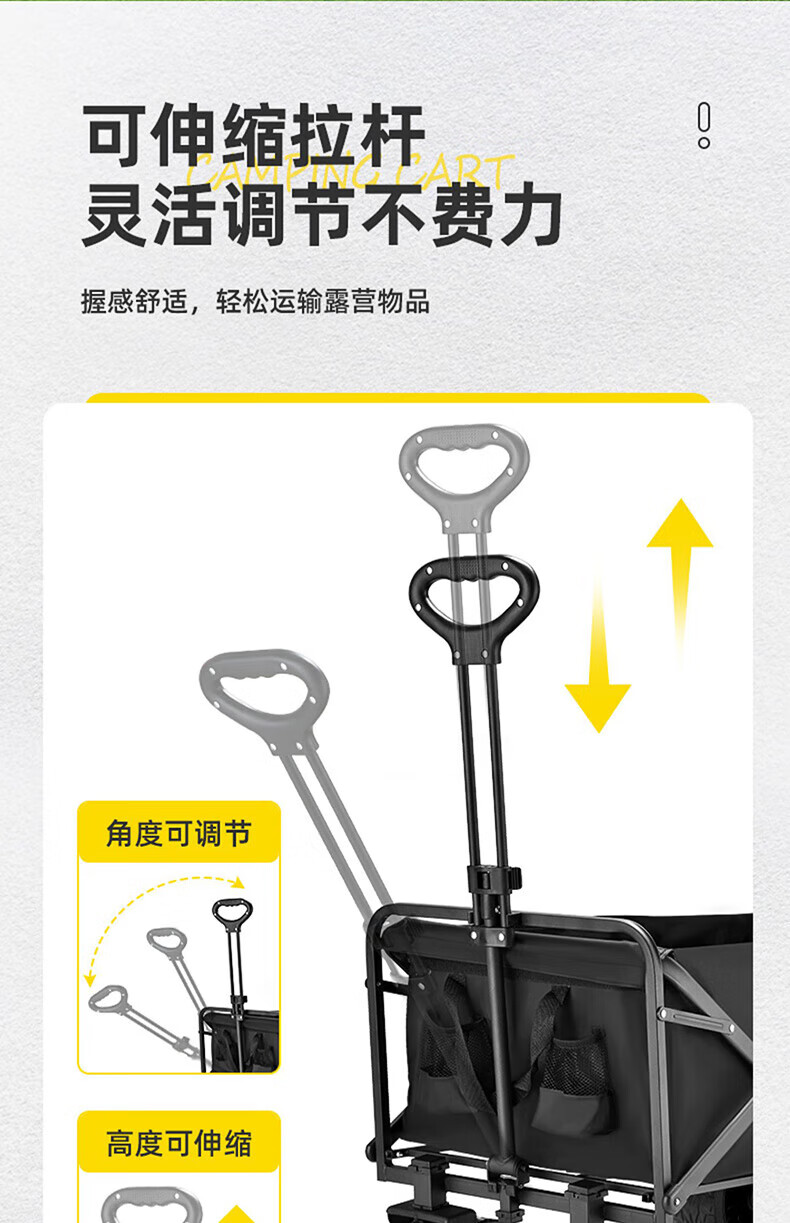 超强承重,轻松承载帐篷、炊具、食材等露营装备,省力又省心。体积小巧不占空间,宽大轮胎设计,沙地、草地、碎石路都能平稳推行,露营无阻。告别肩扛手提,助你畅享户外时光,让露营更轻松!