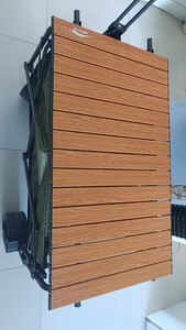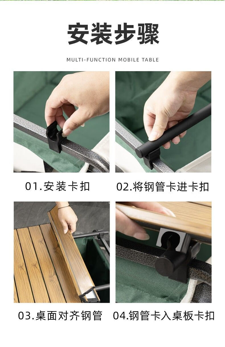 收纳方便,设计合理,正好可以安在我这个露营车上面。4个卡扣卡在露营车上面,4根管进行连接后,卡在露营车两端的卡扣上,桌面的4个卡扣卡在两根管上,折叠桌面就可以很好的固定在露营车上面进行使用。唯一美中不足的是这个折叠桌面没有收纳袋。