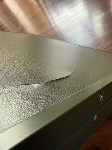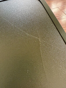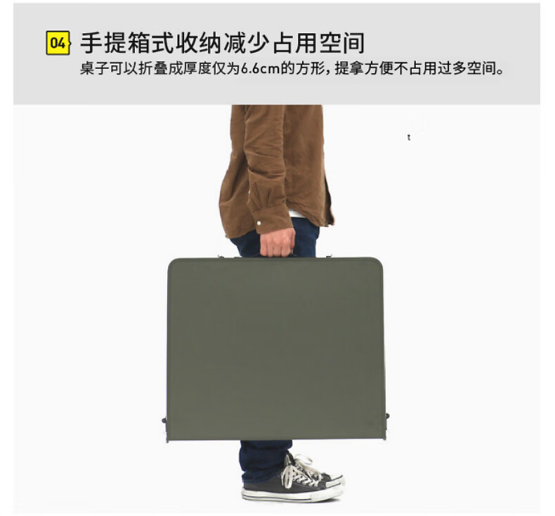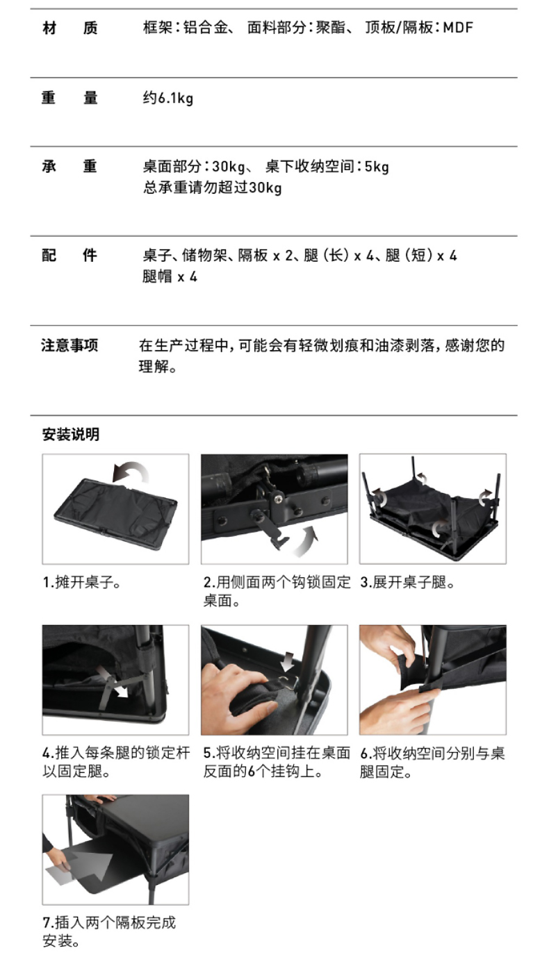 颜值没得说,确实好看,收纳也还算方便。但是,但是,但是,昨天第一次用,用完收的时候,应该是同一侧的桌腿两根管和收纳那个牛津布叠加在一起,导致合上桌面的时候有点厚,就把桌板撑裂了。看看这桌板的厚度(当然,轻量化能理解)和质量,强烈不推荐大伙儿购买!