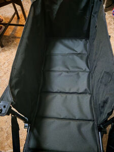 带托斗,带桌板,带双刹,桌板安装方便,托斗打开简单,双层布料,买来露营、溜达超方便,哪天出太阳,开发新功能,拉被子出去晒😎