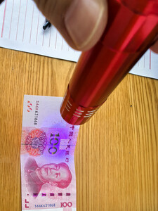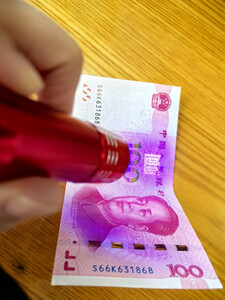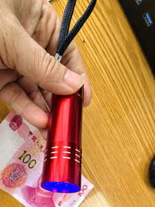 小小的一个紫光灯,还带一个拉绳,随灯送了三个7号的电池。安上就可以使用了,拿百元大钞票里试了一下,那个中间的100防伪看得很清楚。
