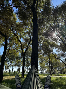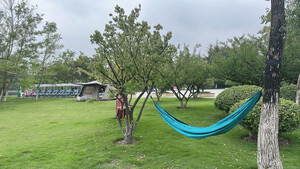 吊床材质很轻便,可以收纳成小小一包,平时放包里都行,但是感觉还很结实,成人在上面完全没问题。