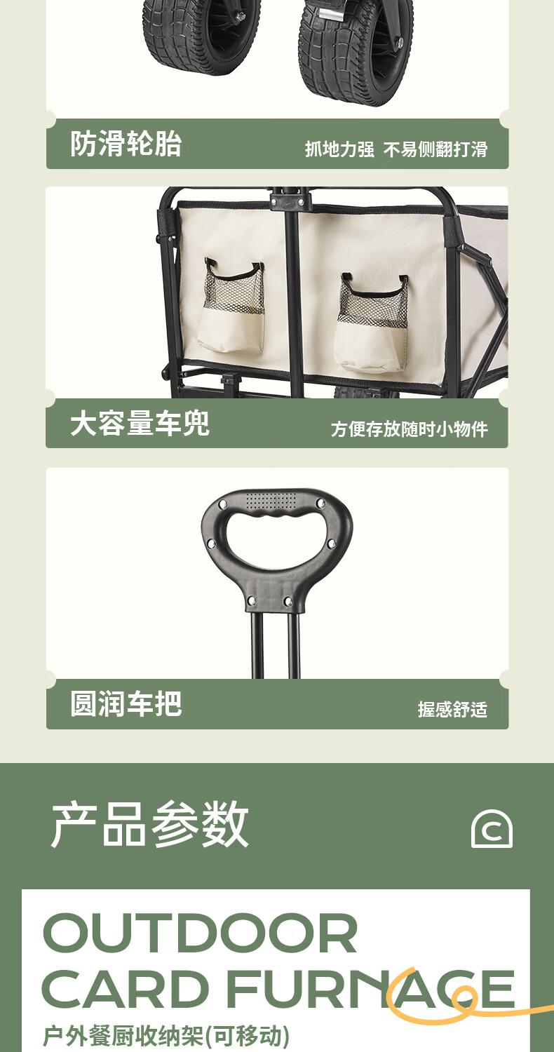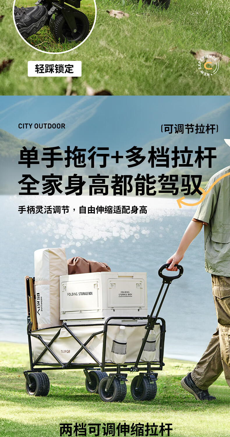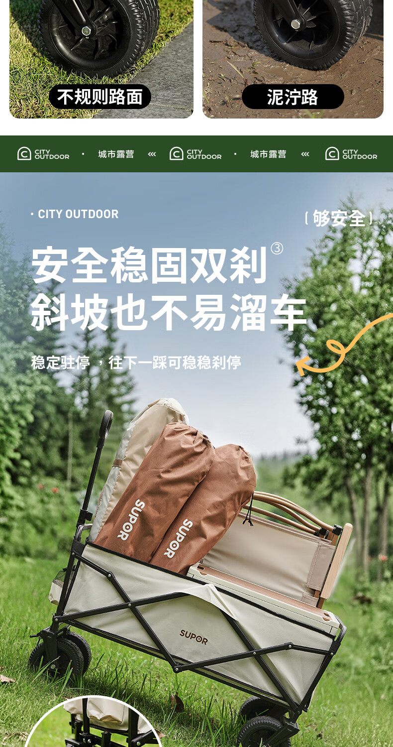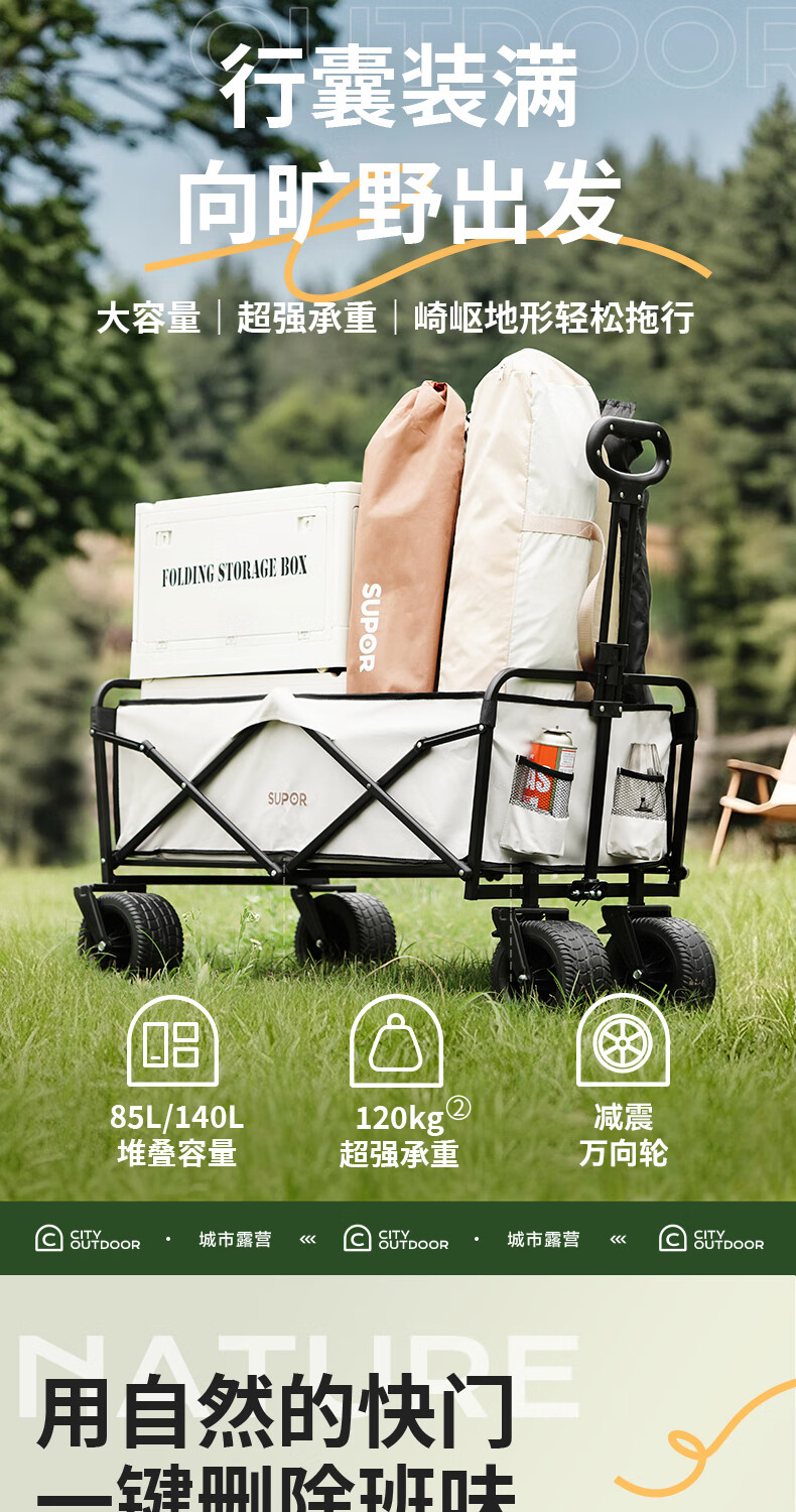 苏泊尔户外露营推车营地车折叠拖车聚拢型野餐摆摊旅行拉车儿童可睡觉 白色 140L 有刹车 碳钢车身+蛋卷桌