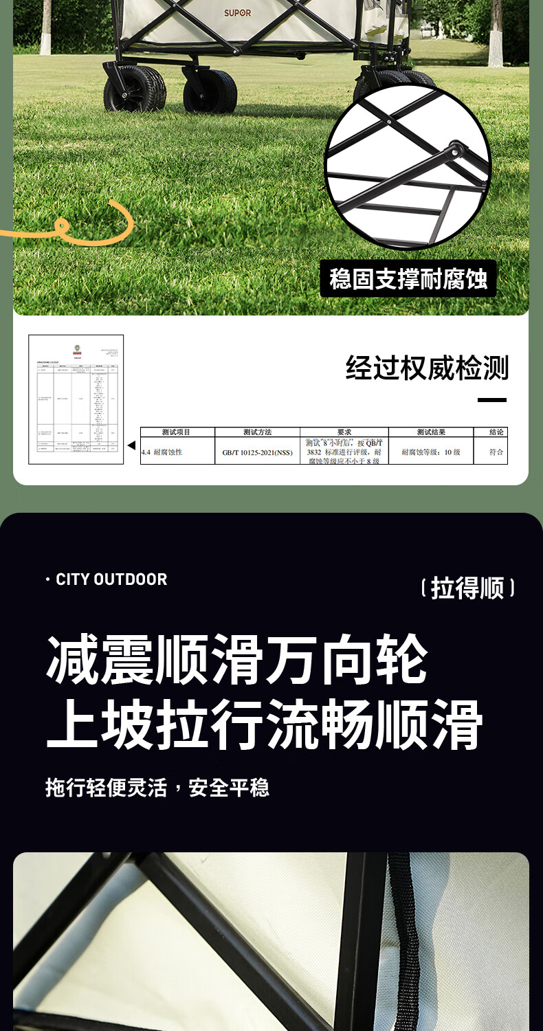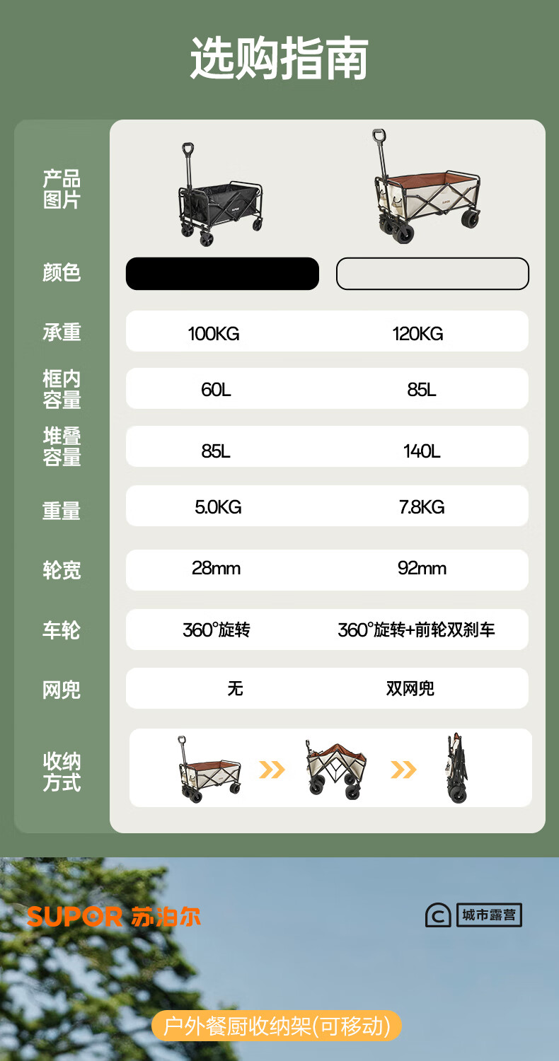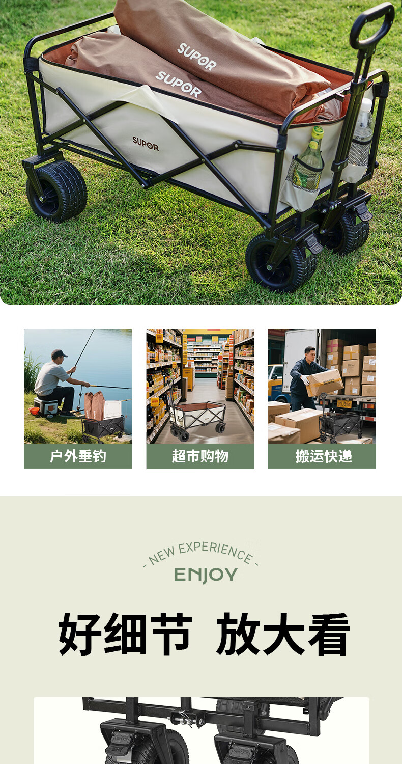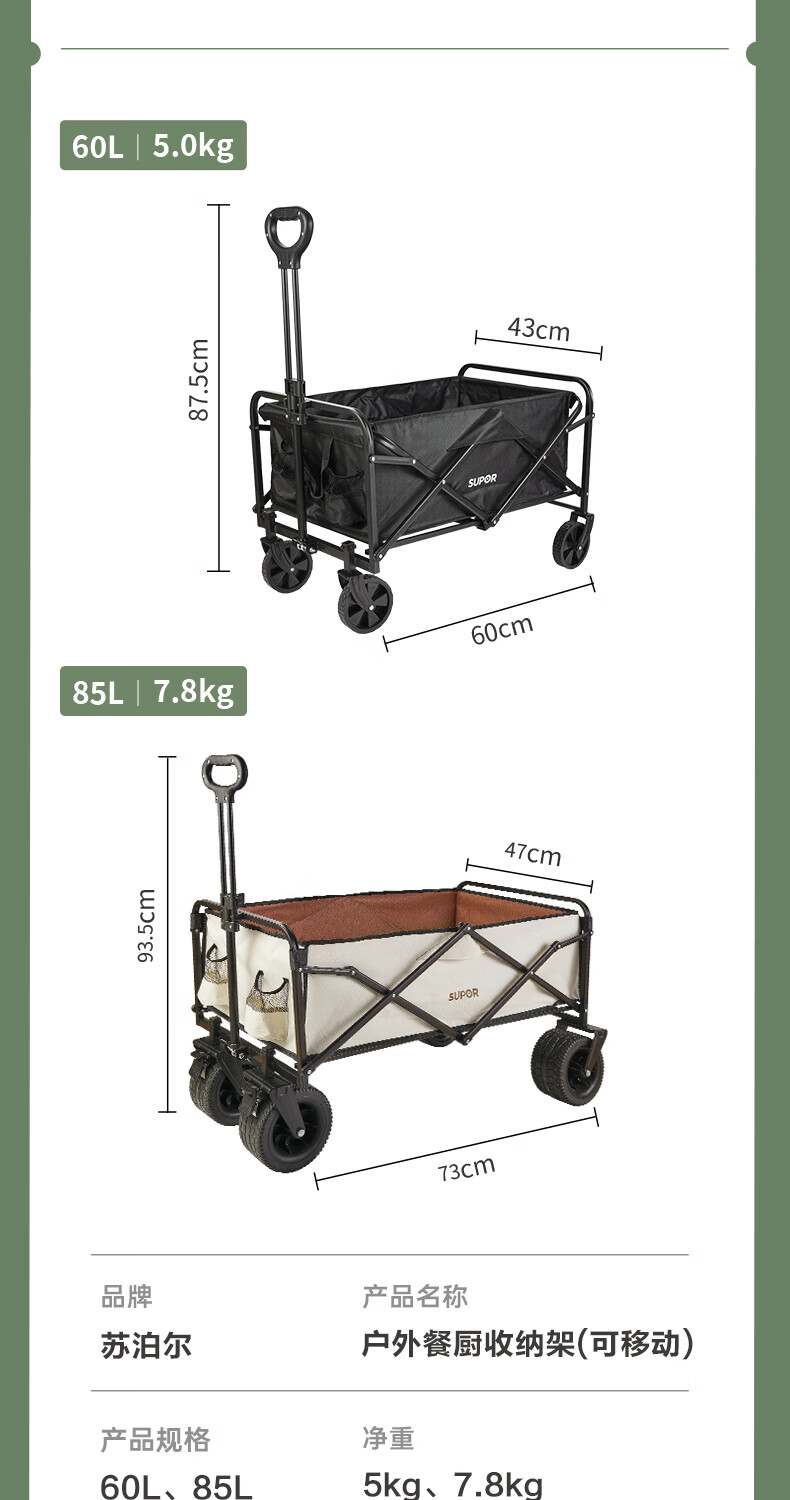 质量真的超级的棒,特别的好,非常的结实牢靠颜值也非常的在线,非常喜欢这一款小车车,材质结实承重强, 折收纳不占地。轮子顺滑推拉轻松,过草地也不卡。看了很多还是苏泊尔的这一款非常有性价比,空间够大。