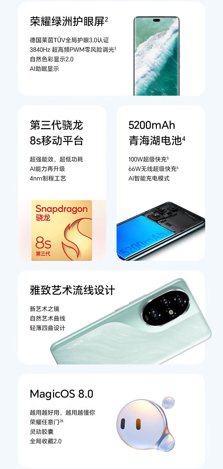 荣耀200pro,新上市5G手机,天海青色,非常漂亮的颜色,之前用荣耀60,非常顺畅,一点也不卡,这次换200pro,配置大升级,支持无线充电,大电池耐用一整天,长时间使用也不发热,支持国货