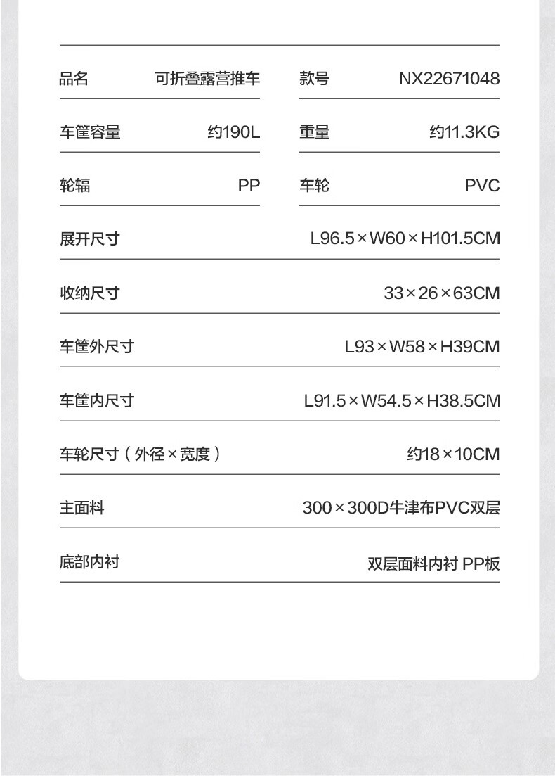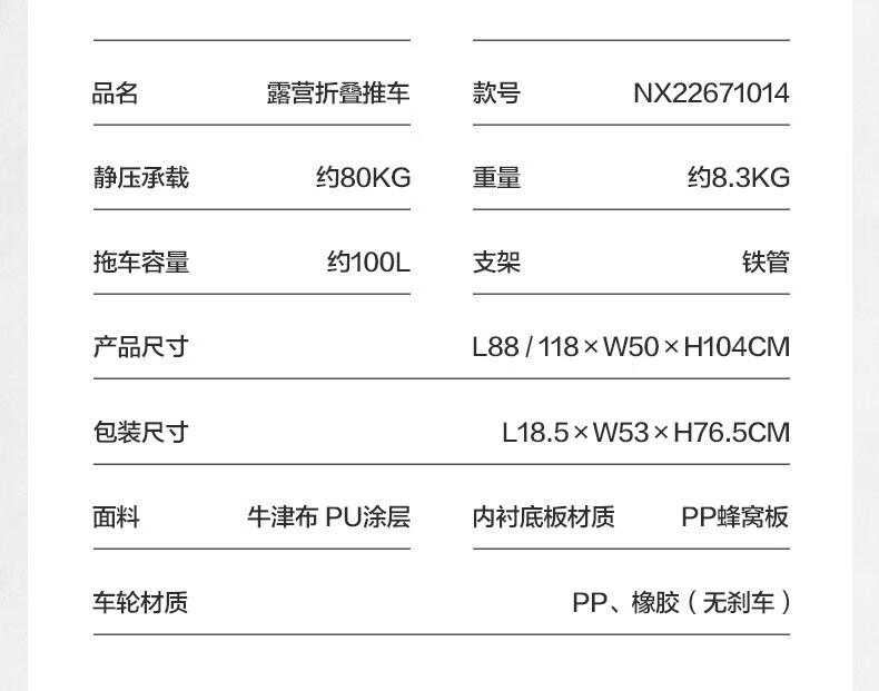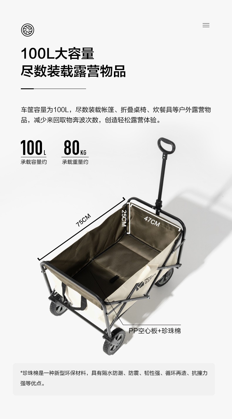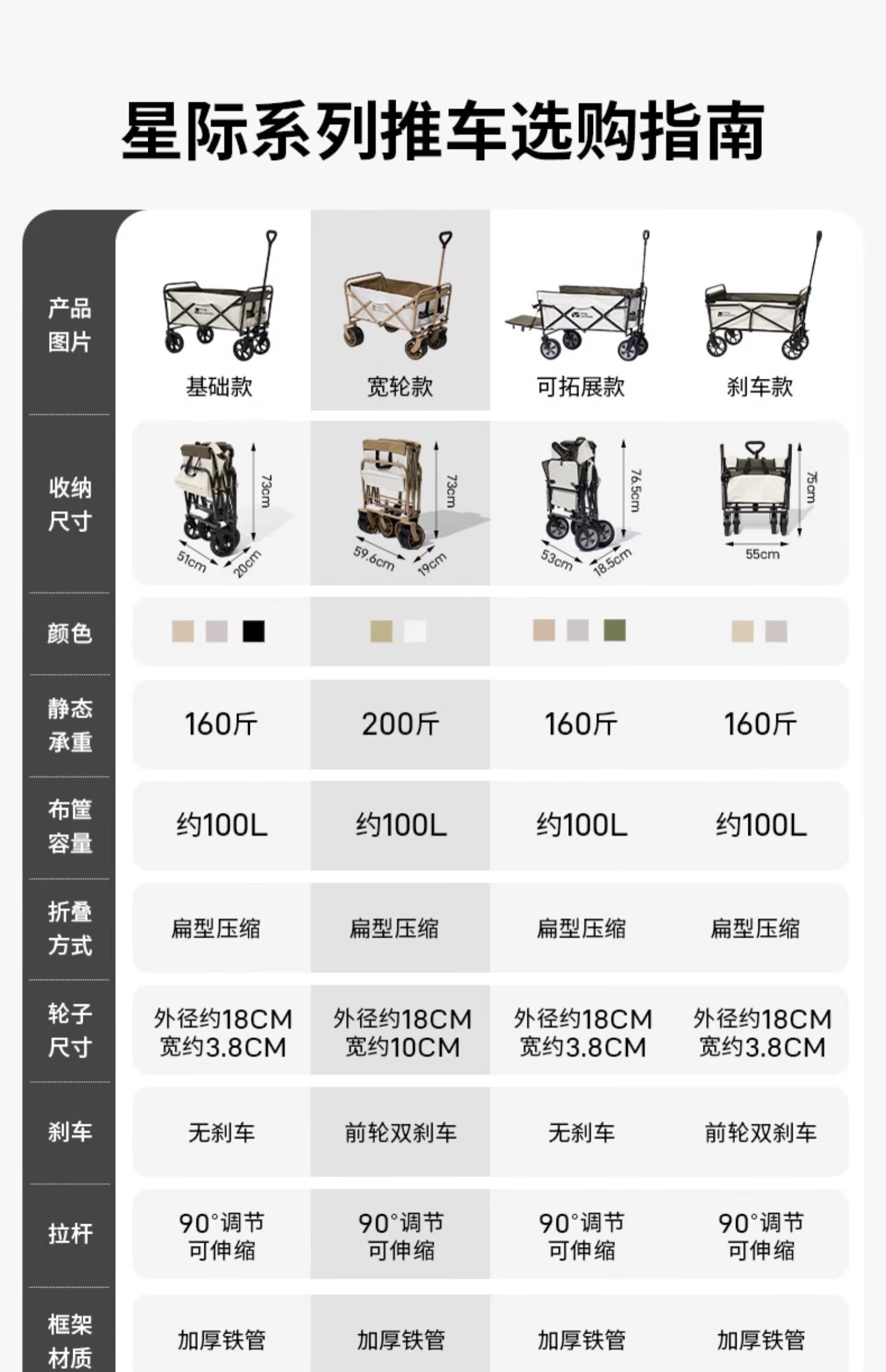 种草了牧高笛星际拓展版露营推车很久,这款从容量和便携程度作为考虑都相当适合家庭露营。牧高笛产品我入手了几大件,大品牌品质的确保证,细节方面做得很用心。80KG的承重量已经相当够用,单个超过20KG以上的露营装备几乎没有。容量上虽然不如其他品牌推车那么大,但是推车作为露营搬运的辅助工具,利用率不大,轻便够用就行,不然太浪费后备空间。而且后尾可以放平是解决了长款帐篷无法放平的痛苦,此款露营推车自己心目中那是相当完美。