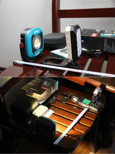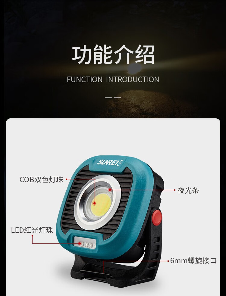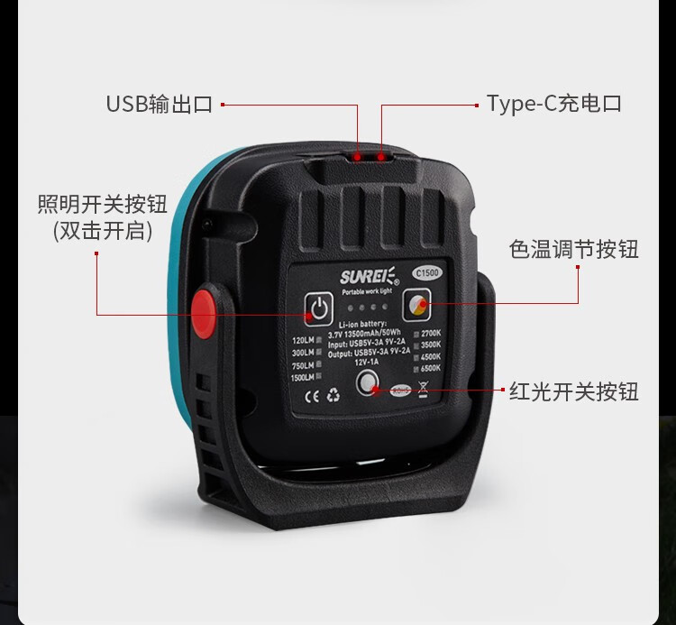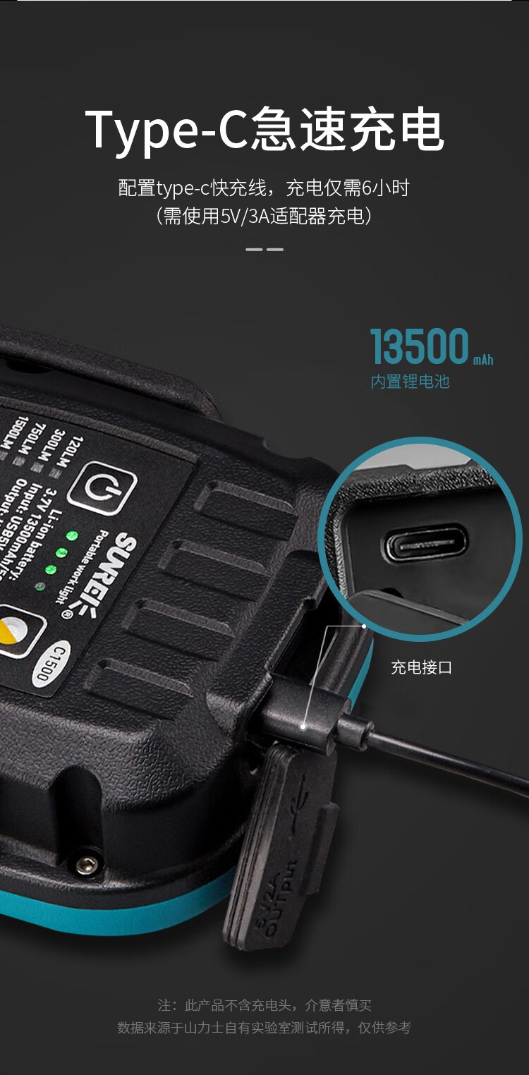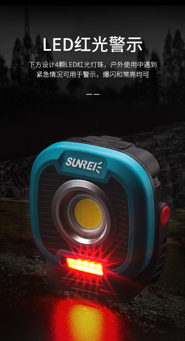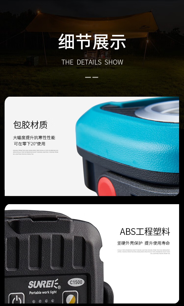 这山力士C1500户外灯野营帐篷灯充电亮露营灯防水营地灯工作照明 C1500金属外壳有分量,比微笑鲨户外应急强光多功能强磁手电筒的工程塑料外壳要显得更好很多,当然价格也贵了一倍多,二者的功能都还行,山力士的亮度测试过最强档高达陆千四白多勒克丝,弱光档照明时只有一千五武多勒克丝,4粒小红光灯珠没爆闪功能,四方设计外形比较酷,能调节四档色温,亮度也有4档调节但可惜按钮是与开关共用的,因此调节亮度时不方便,老是会按成开或关,需要按很多次。虽然是轻触按钮但是并没有LED手电那种很好用的强弱力度区分控制,其底部磁铁大磁力强,能很好的吸到金属上面保持整个灯的稳定。而微笑鲨虽然轻很多可磁铁小反而磁吸的不稳当,无法保持横向磁吸固定。我看到二者各有千秋所以同时都买下了,以前车上只备了小手电,8月初的一个雨天深夜,因会车受对向灯光影响未及时看清前方路边掉落的碎裂小山石,我的右前车轮撞上去爆胎了,冒着小雨更换备胎,非得有人帮忙在旁边拿着照明不可,这是决定购买这二个户外防水应急灯的动因。续航时间不知道能不能达到8小时。看电量尚剩余不少,就这样先放到车上喽!希望它俩到要用的时候可别掉链子。