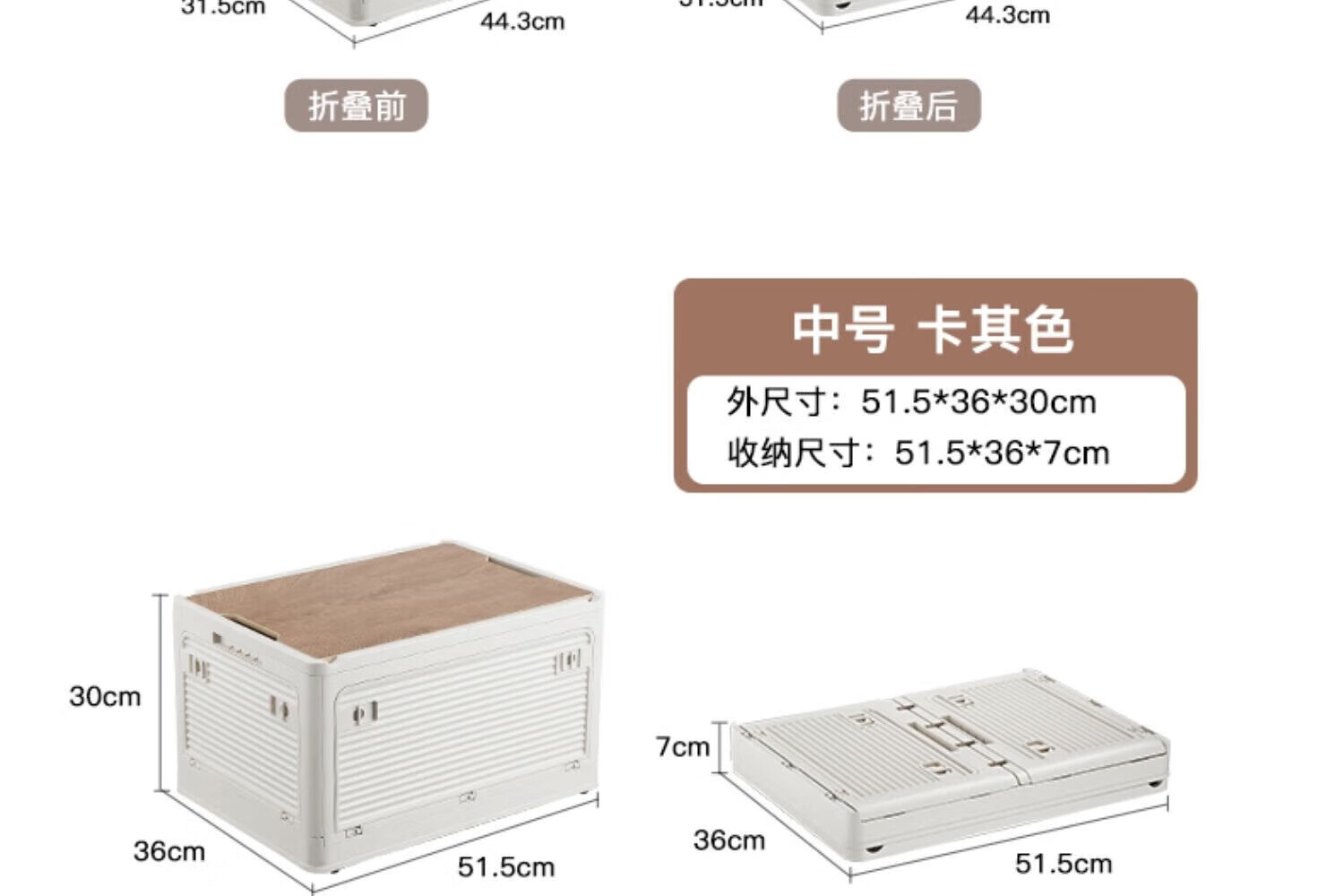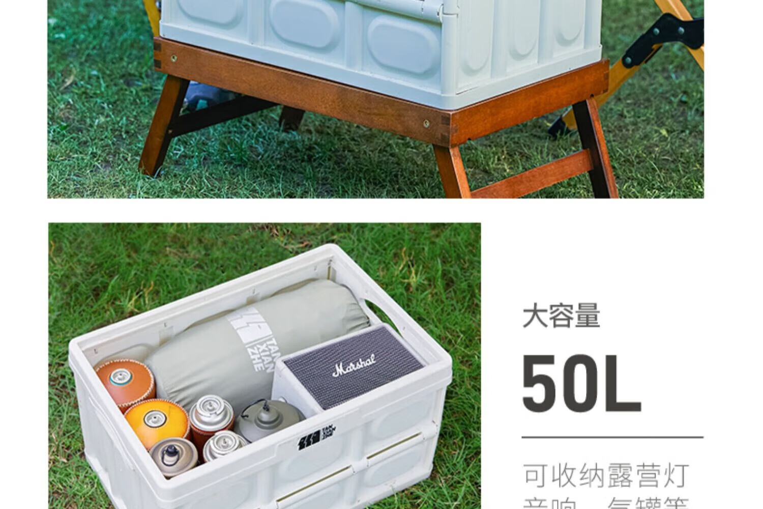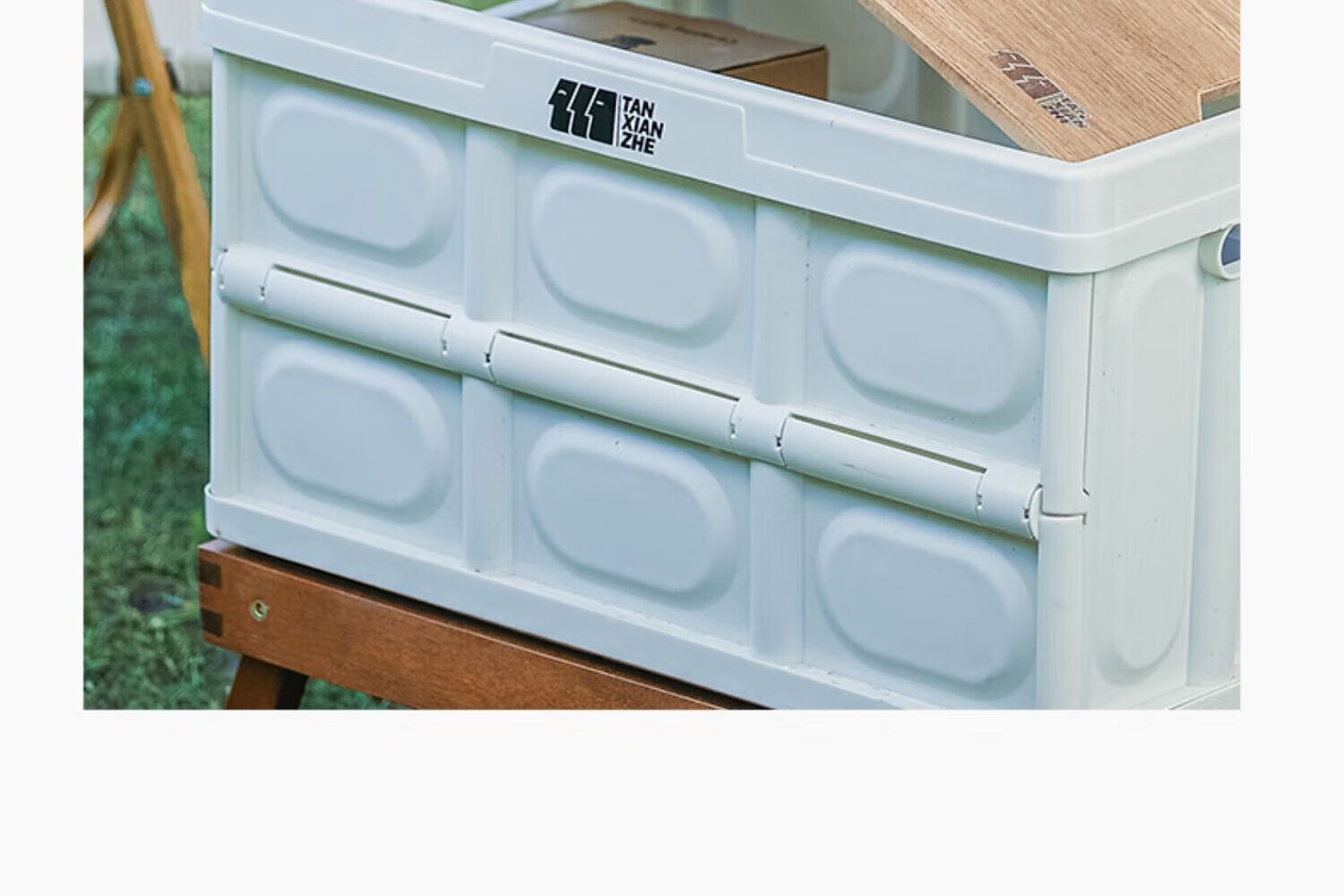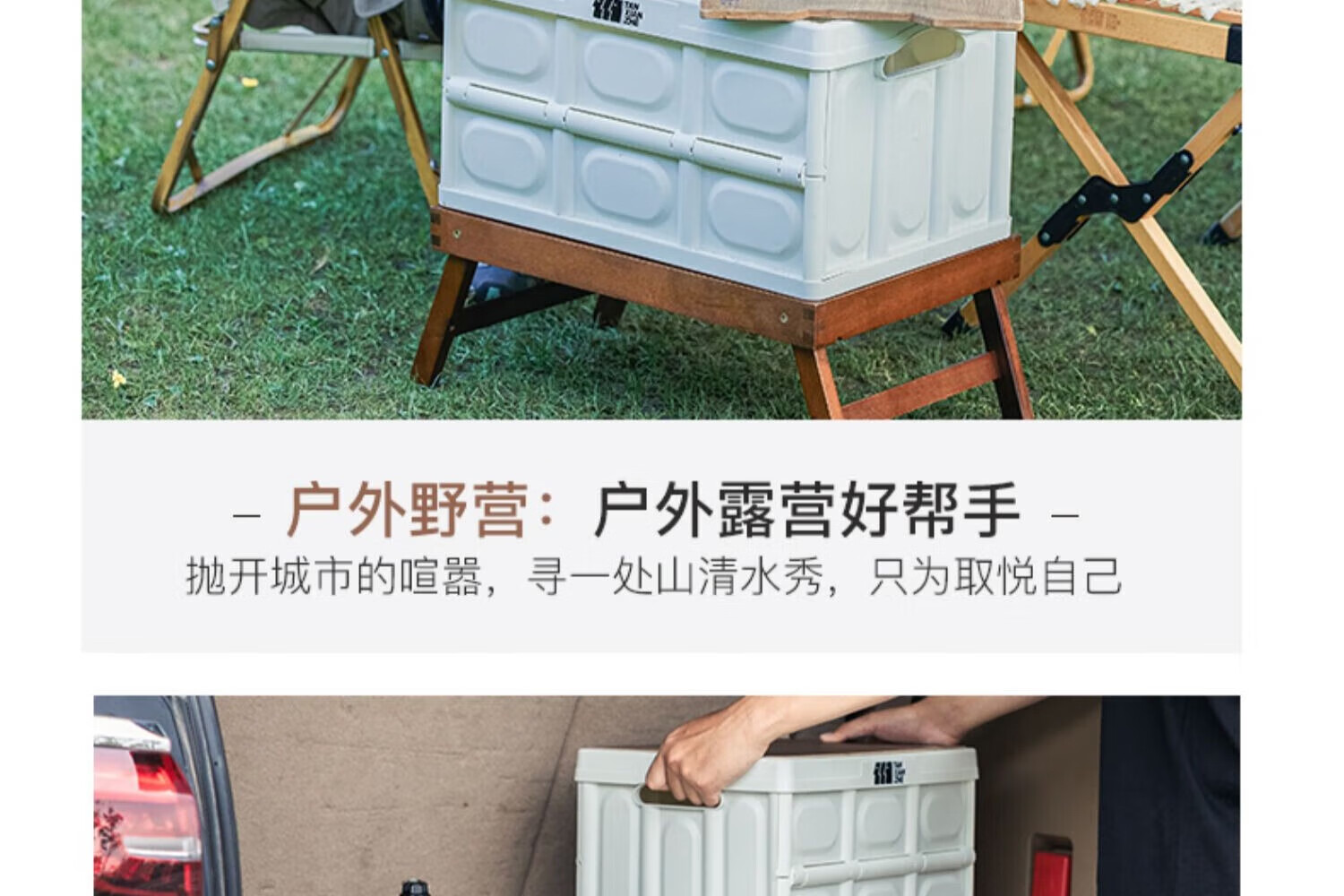 折叠收纳箱收起来很小 打开却很能装;平时露营可以用也可以放后备箱 在家里当储存箱同样不错,但木板是高密度板 要注意防水保护!