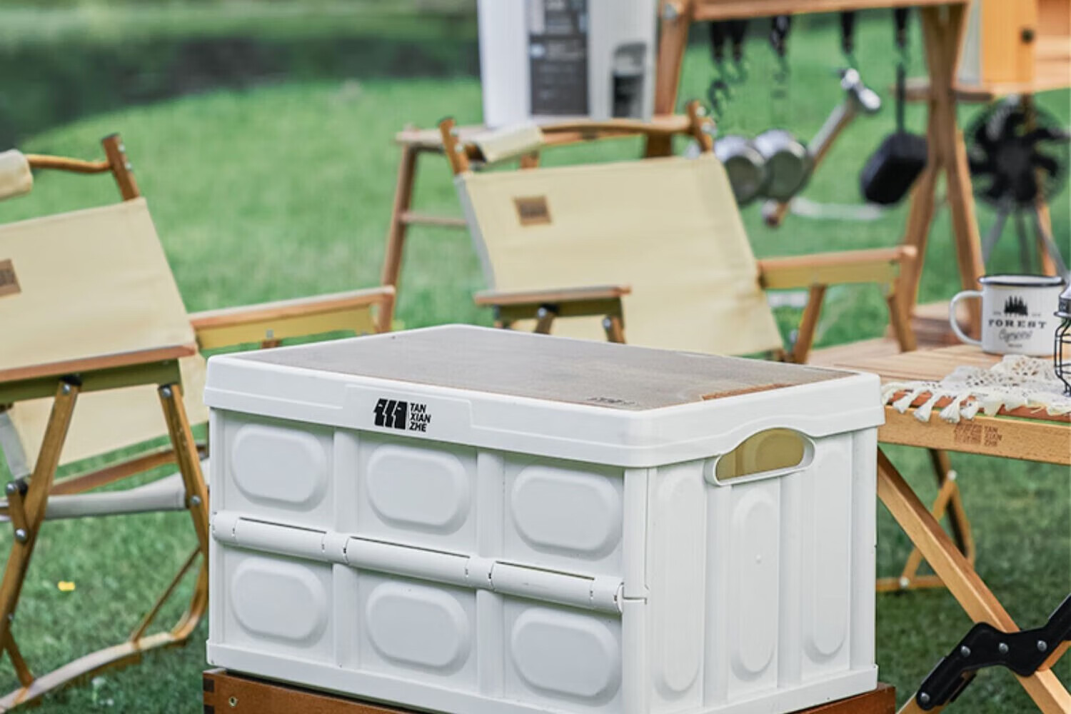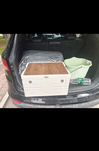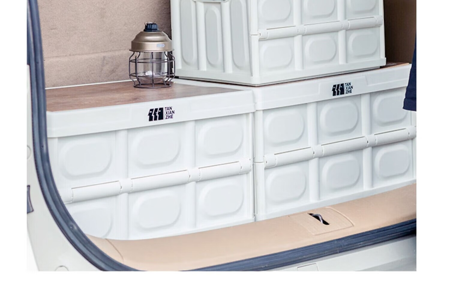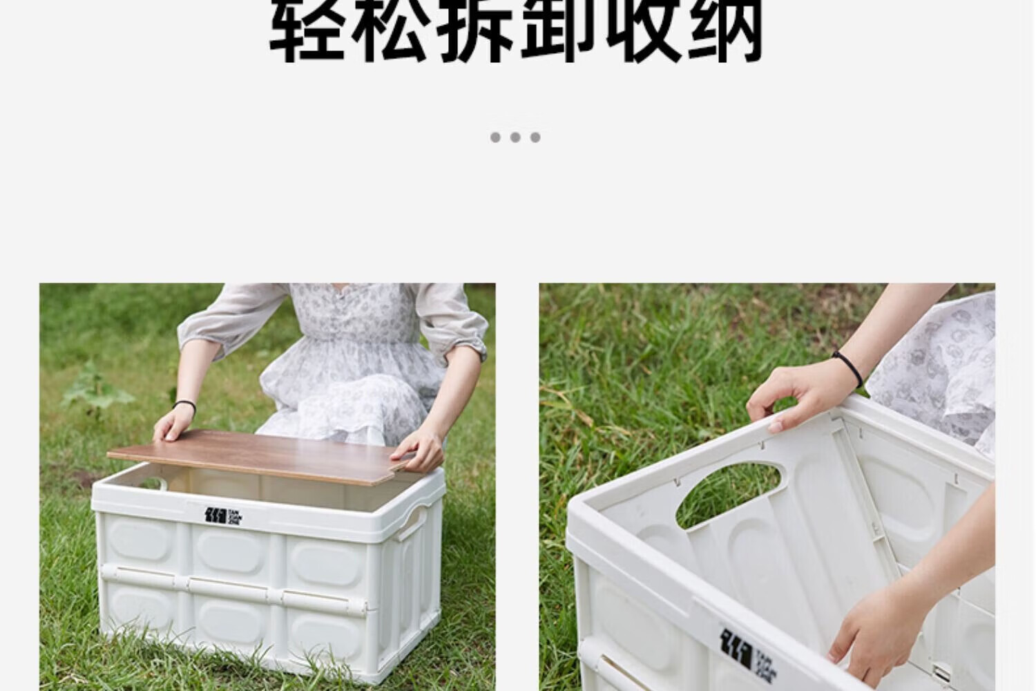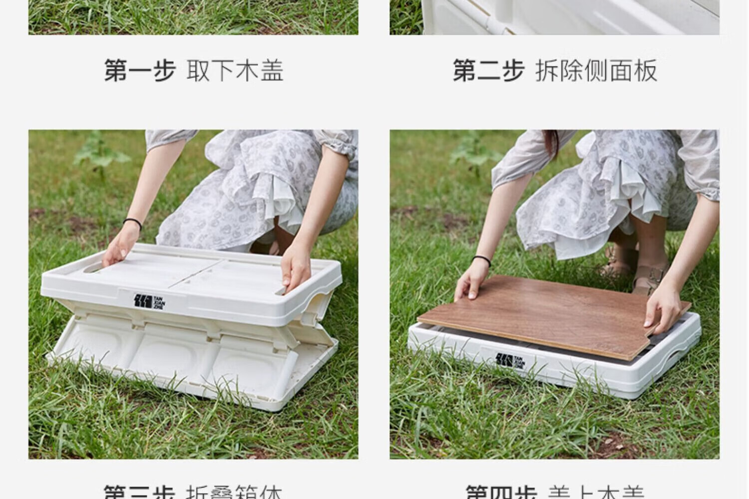 折叠收纳箱收起来很小 打开却很能装;平时露营可以用也可以放后备箱 在家里当储存箱同样不错,但木板是高密度板 要注意防水保护!