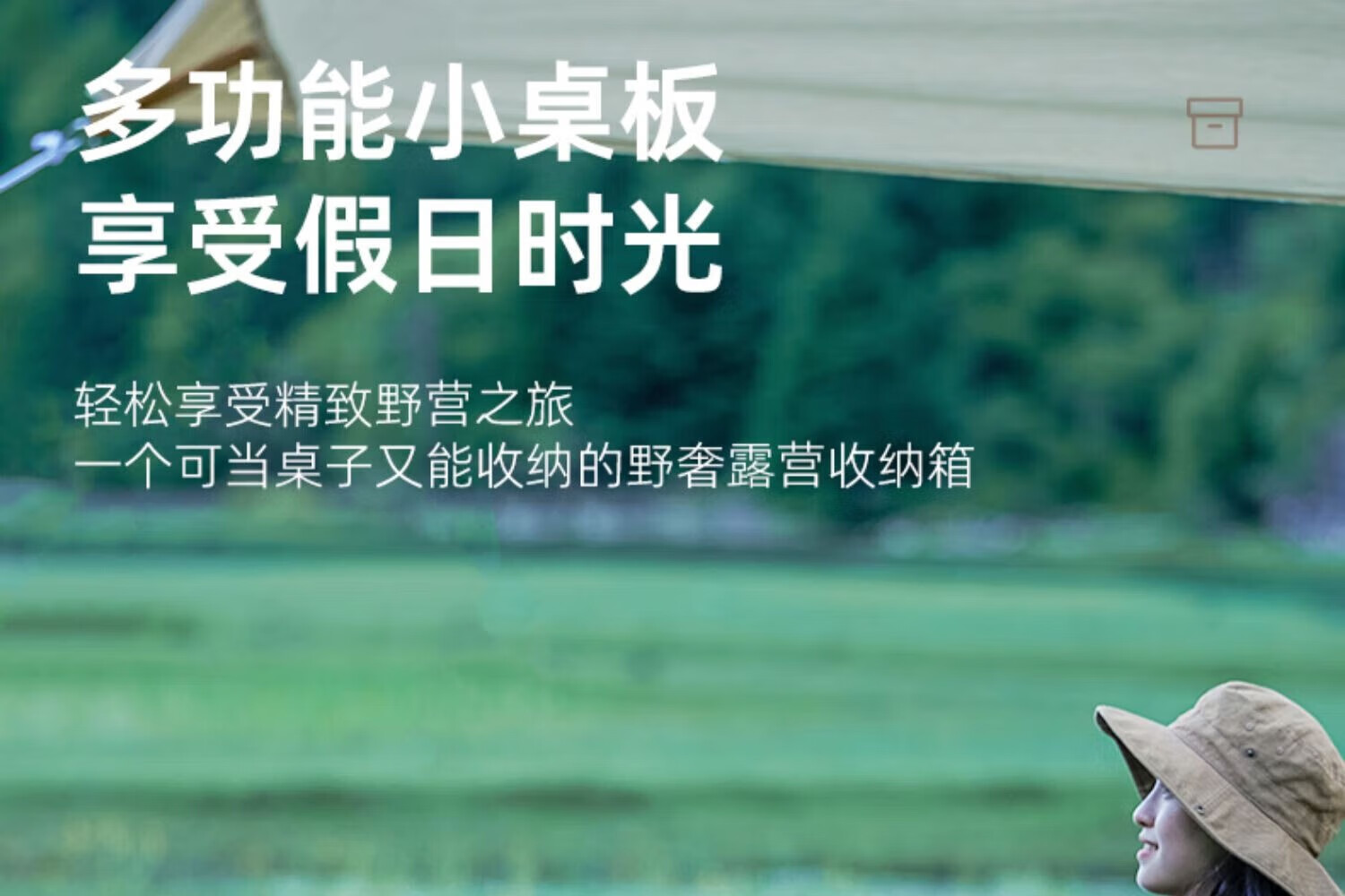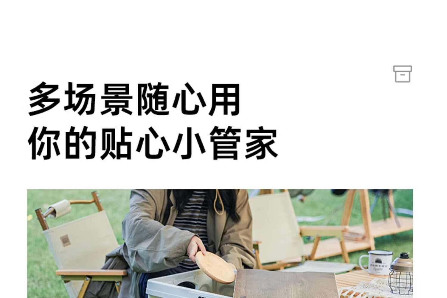 收纳箱配合露营桌椅,氛围效果满满,颜值高,很好看。质量不错,装很多东西都承受得住,方便实用。