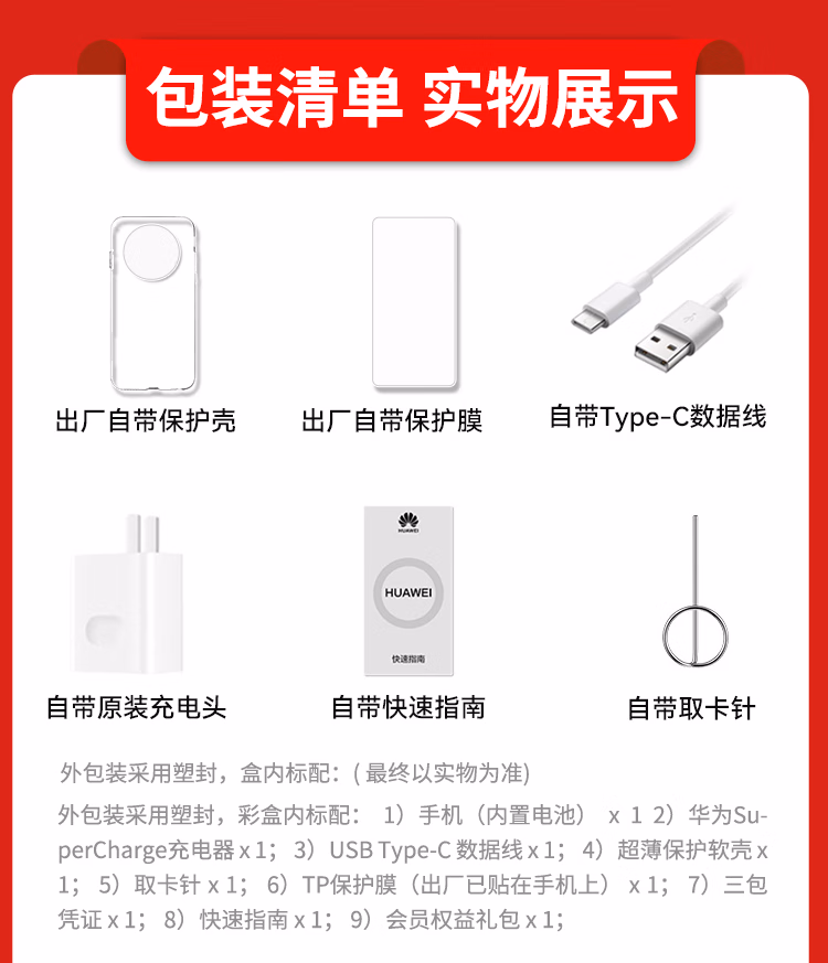 外包装采用塑封,彩盒内标配: (1)手机(内置电池) × 1 (2)华为SuperCharge充电器(Max 40W) × 1 (3)USB Type-C 数据线 × 1 (4)保护膜(出厂已贴在手机