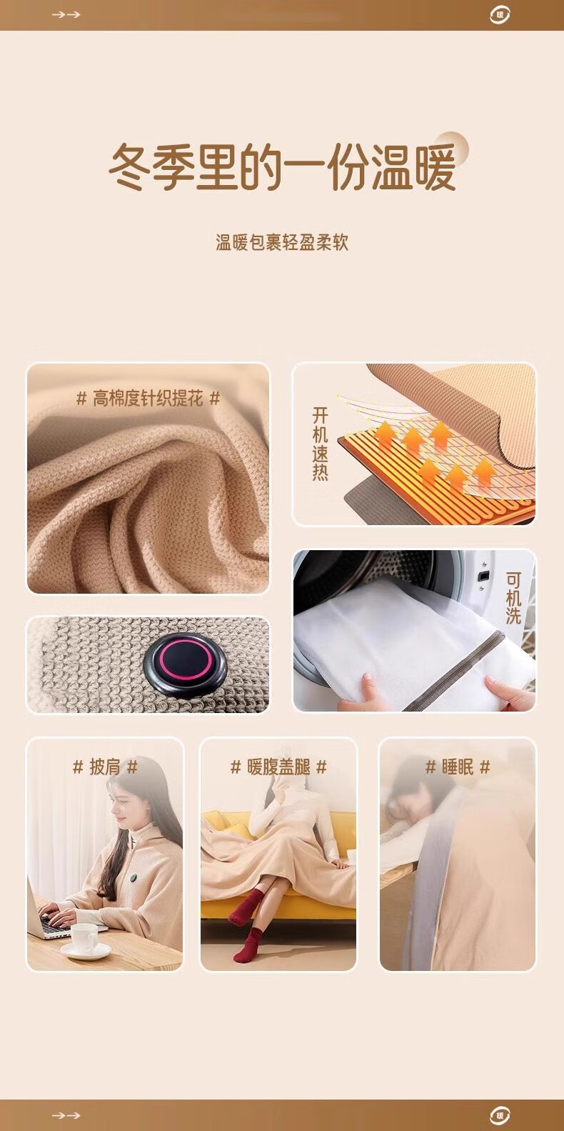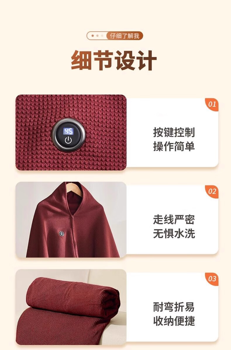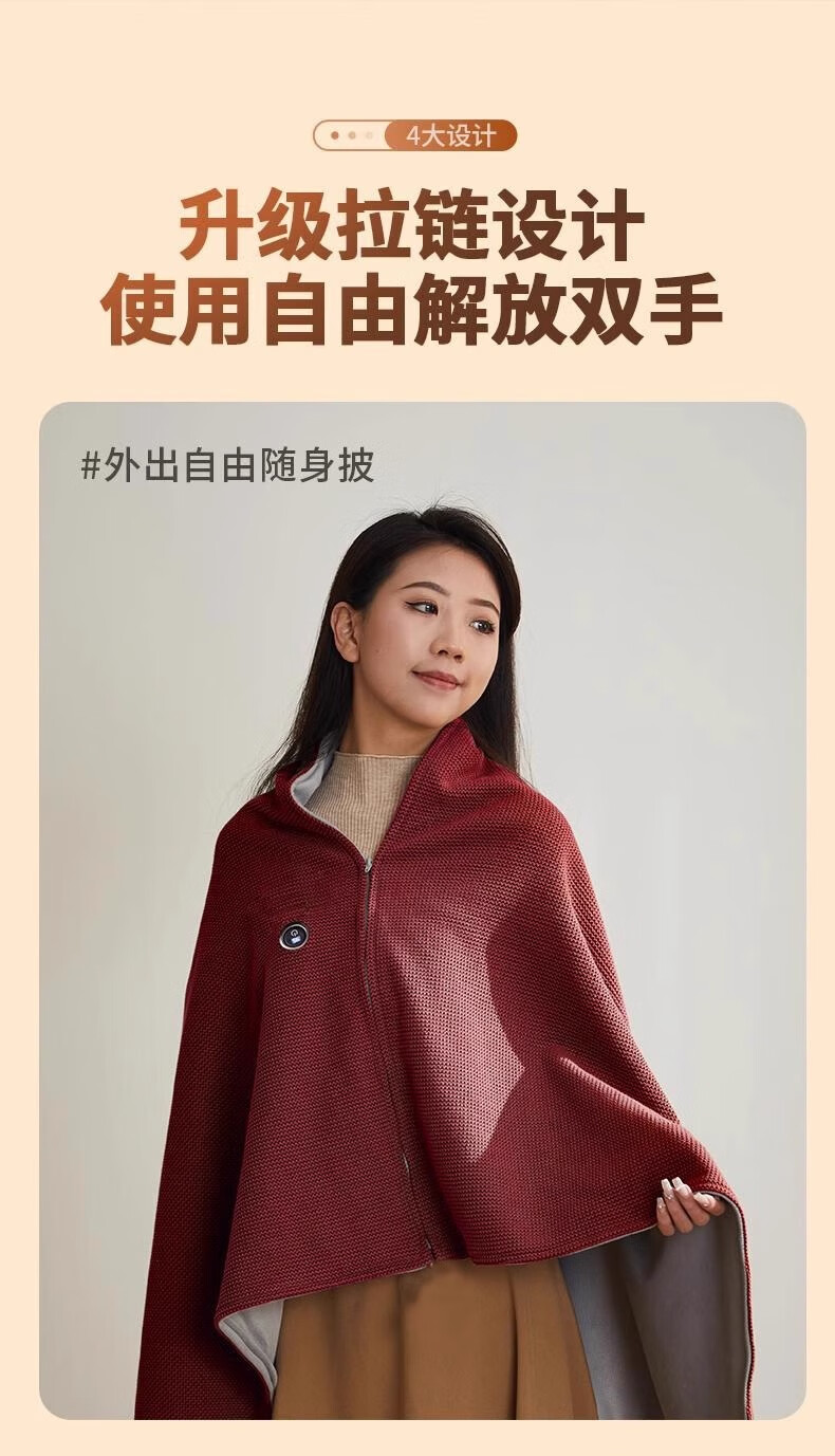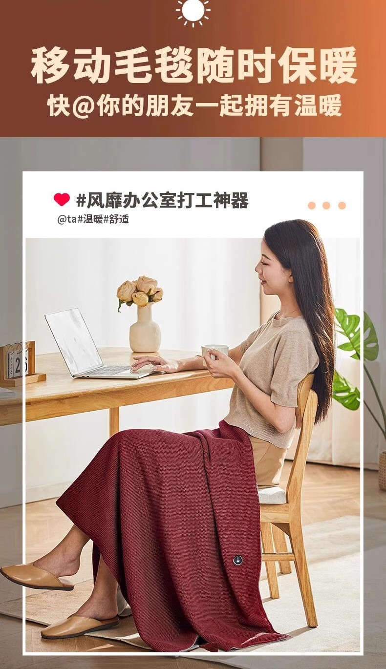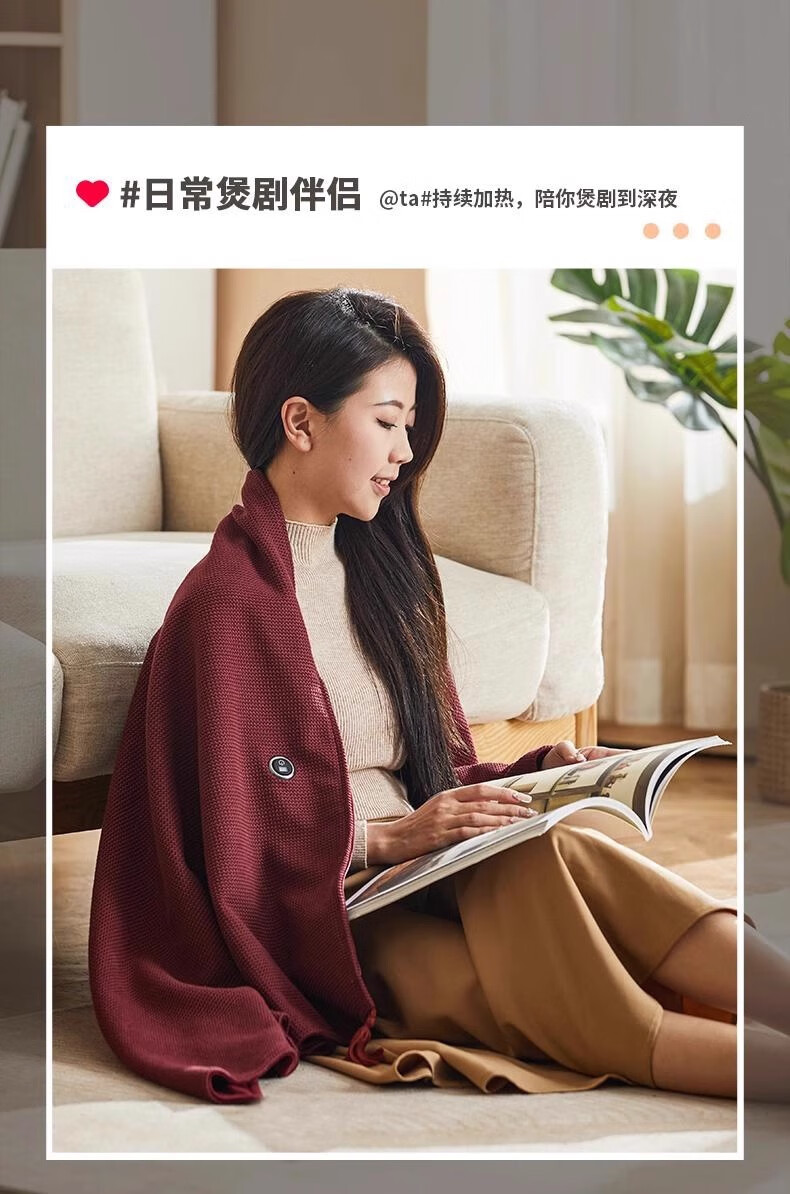 这款电热披肩毯真的很实用,冬天在家办公或者追剧时披上,暖暖的很舒服。USB接口设计方便,插充电宝就能用,温度调节也很灵活。关键是还能水洗,用了一段时间也没变形,质量不错。整体性价比高。