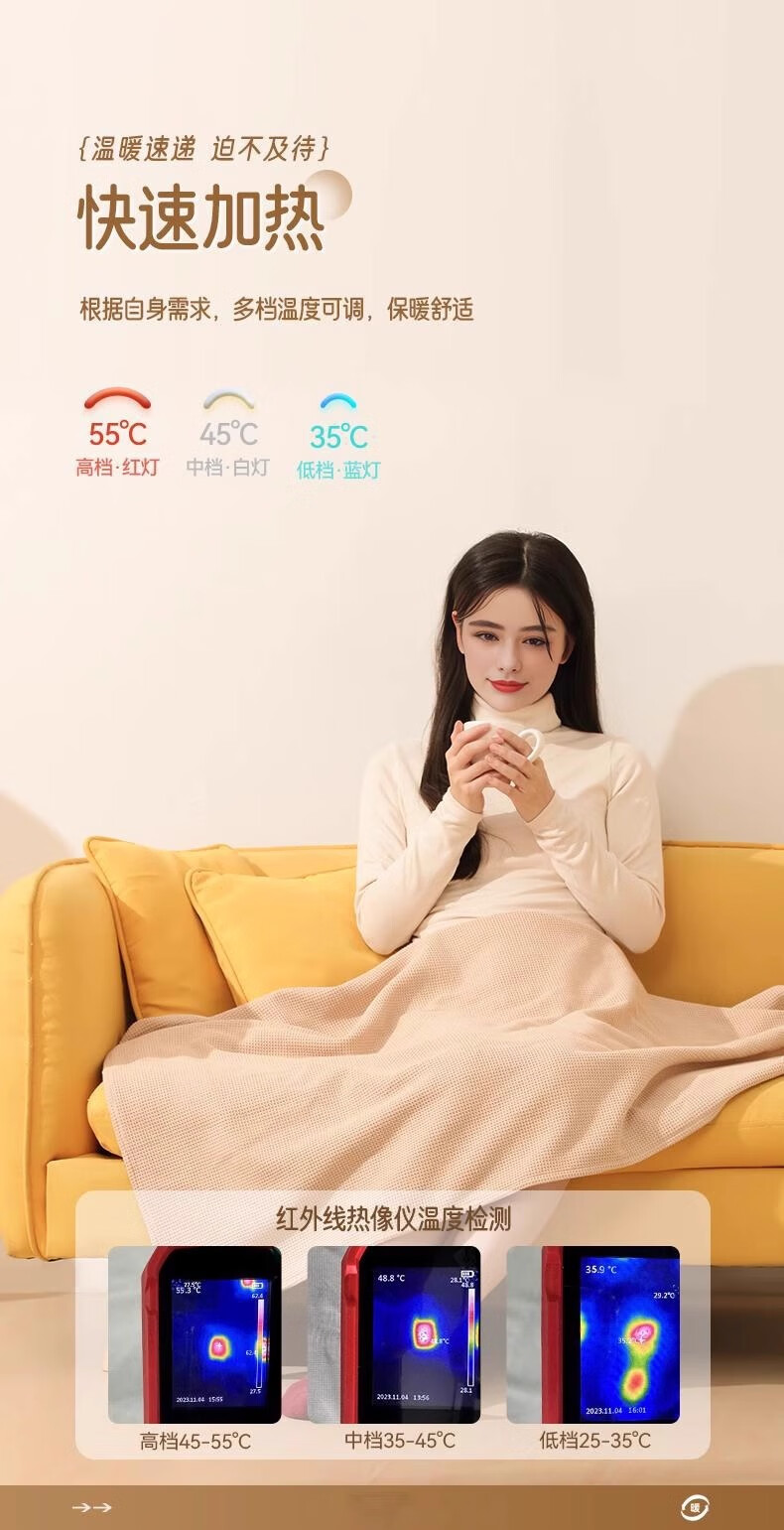买了这个冬天必备神器,真的超实用!USB充电设计很方便,办公室或家里都能用。升温快,三档温度调节很贴心,盖着肩膀暖暖的,久坐也不怕冷。材质柔软舒服,清洗也方便。性价比高!