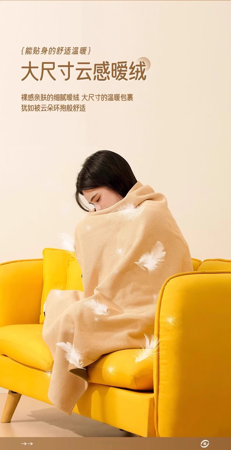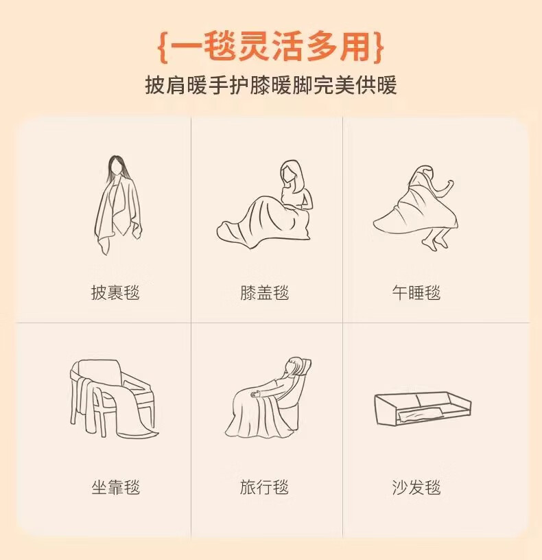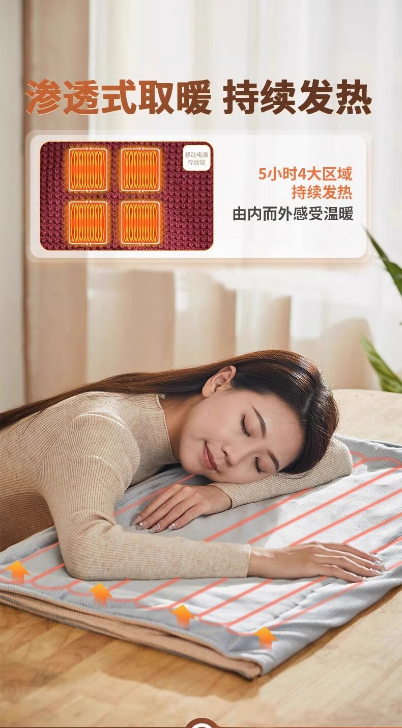 第一次买这种加热的毯子,冬天在家用真的很舒服。加热速度挺快的,温度可以调节,披在身上暖烘烘的。材质摸起来软软的,清洗也方便。续航时间够用,充满电能用好几个小时。偶尔在客厅追剧或者办公的时候披着。