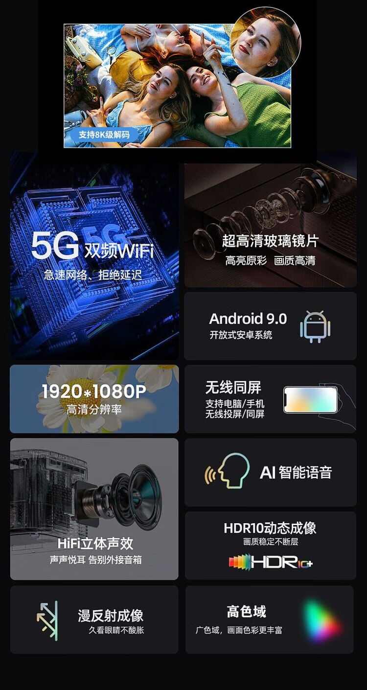 8K解码让画质超高清,新一代智能投影技术加持,画面细腻流畅,适配华为设备很便捷,家用打造家庭影院效果绝佳,操作简单,画质与音质表现出色,大屏观影爱好者值得入手。