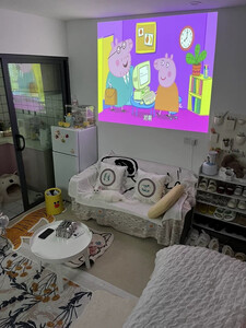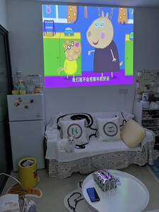 投影仪看着非常高科技,拿在手上却非常轻巧方便。开机之后亮度也很高,色彩非常鲜艳,音响音质也非常好。放在卧室就是一个私人影院。太爽了。
