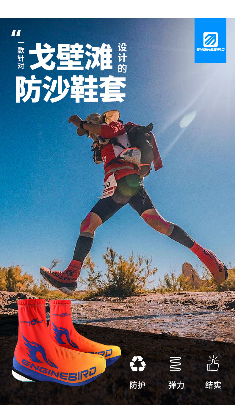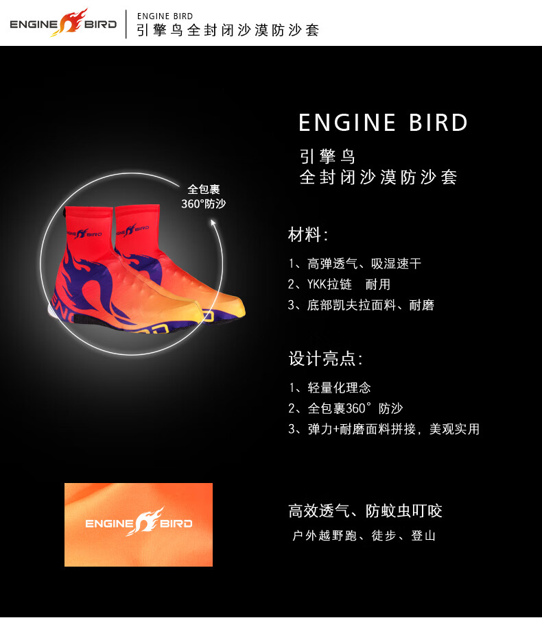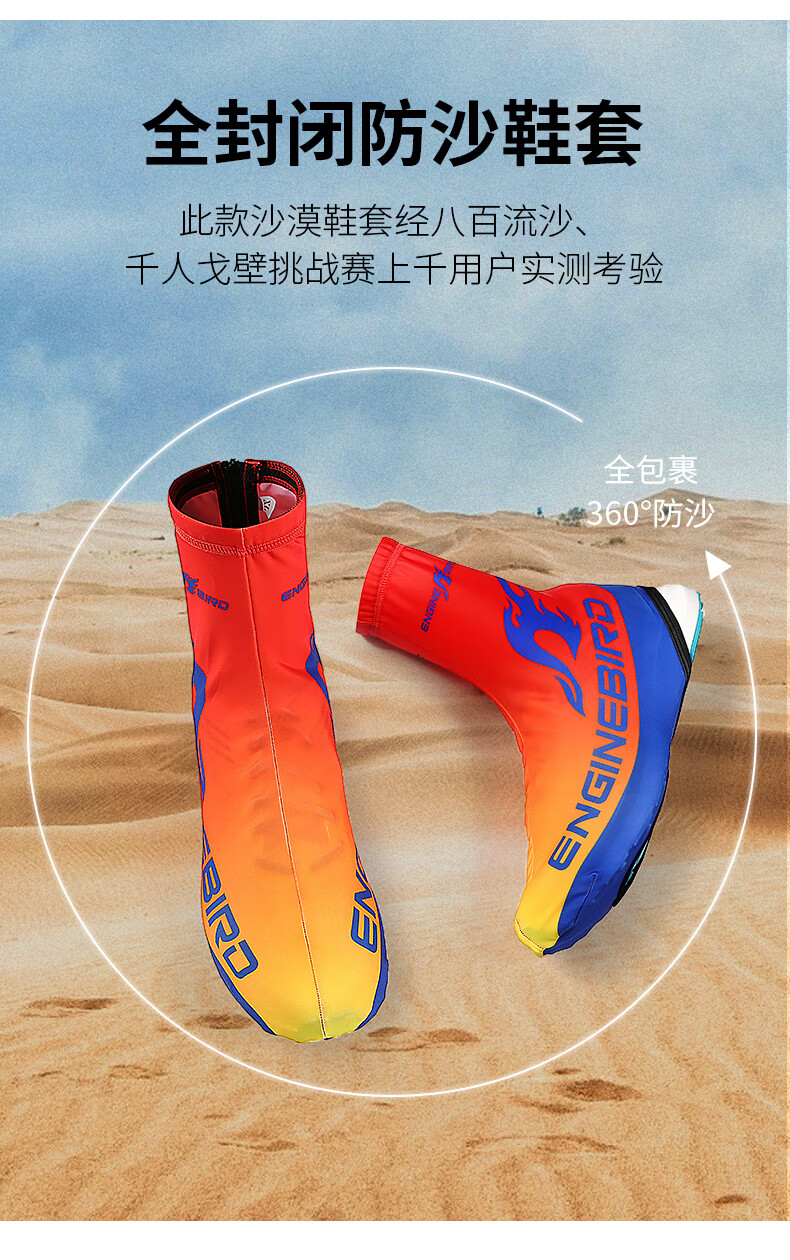 引擎鸟户外防沙鞋套凭借出色的防沙效果、全面的防护功能、舒适的穿着体验和广泛的适用性,是我户外及越野的的理想选择,无论是沙漠探险还是山地徒步,都能有效保护双脚,提升户外活动的舒适度和安全性。它携带方便,透气,耐磨,性价比高。