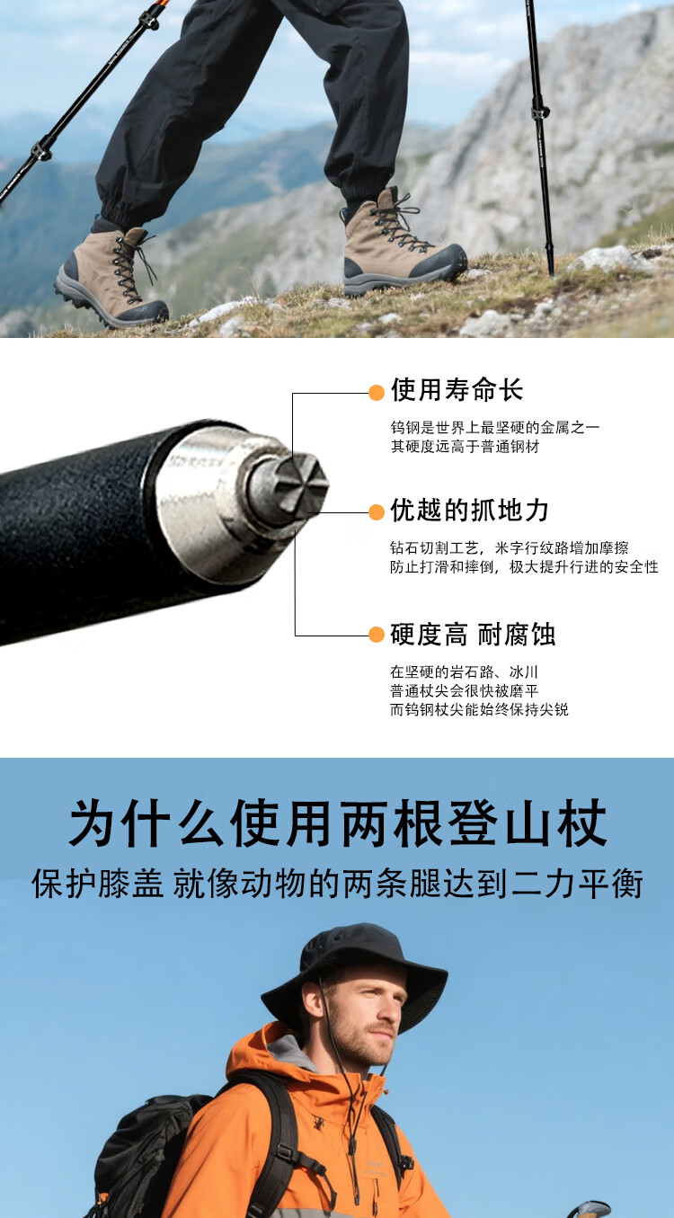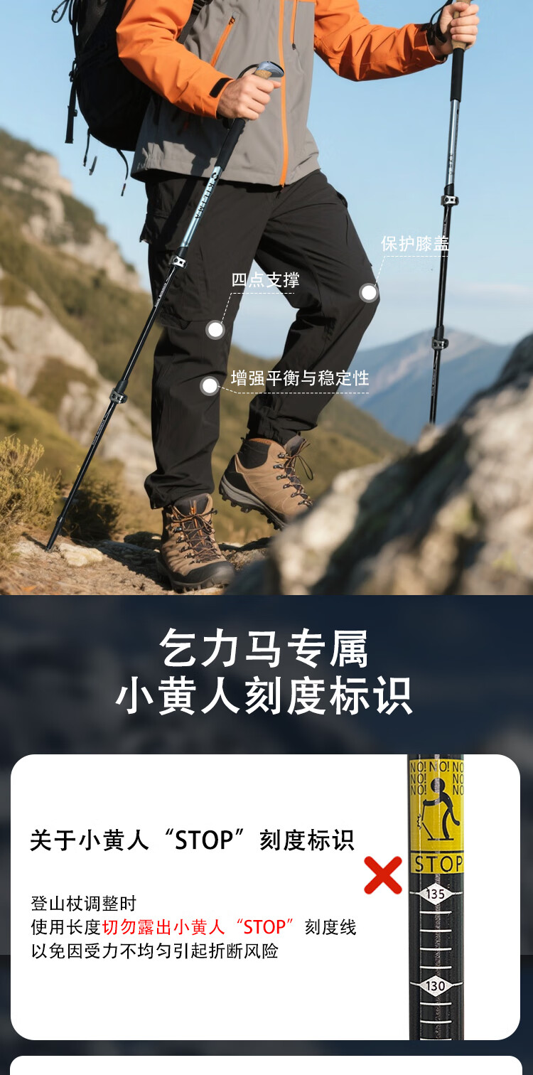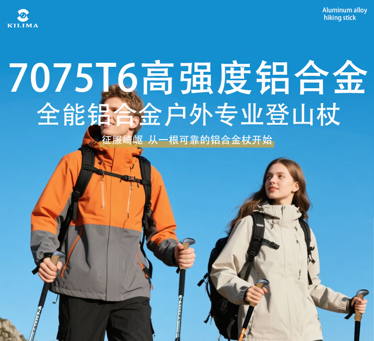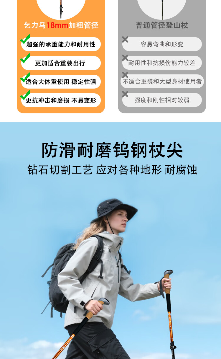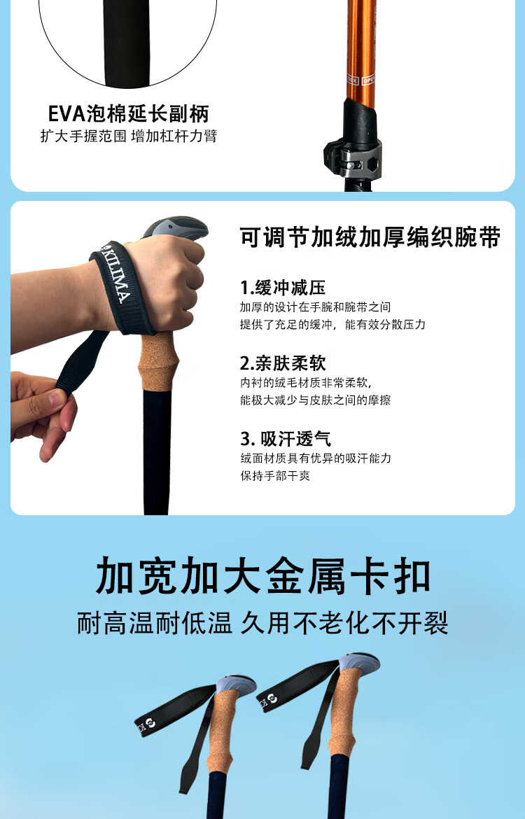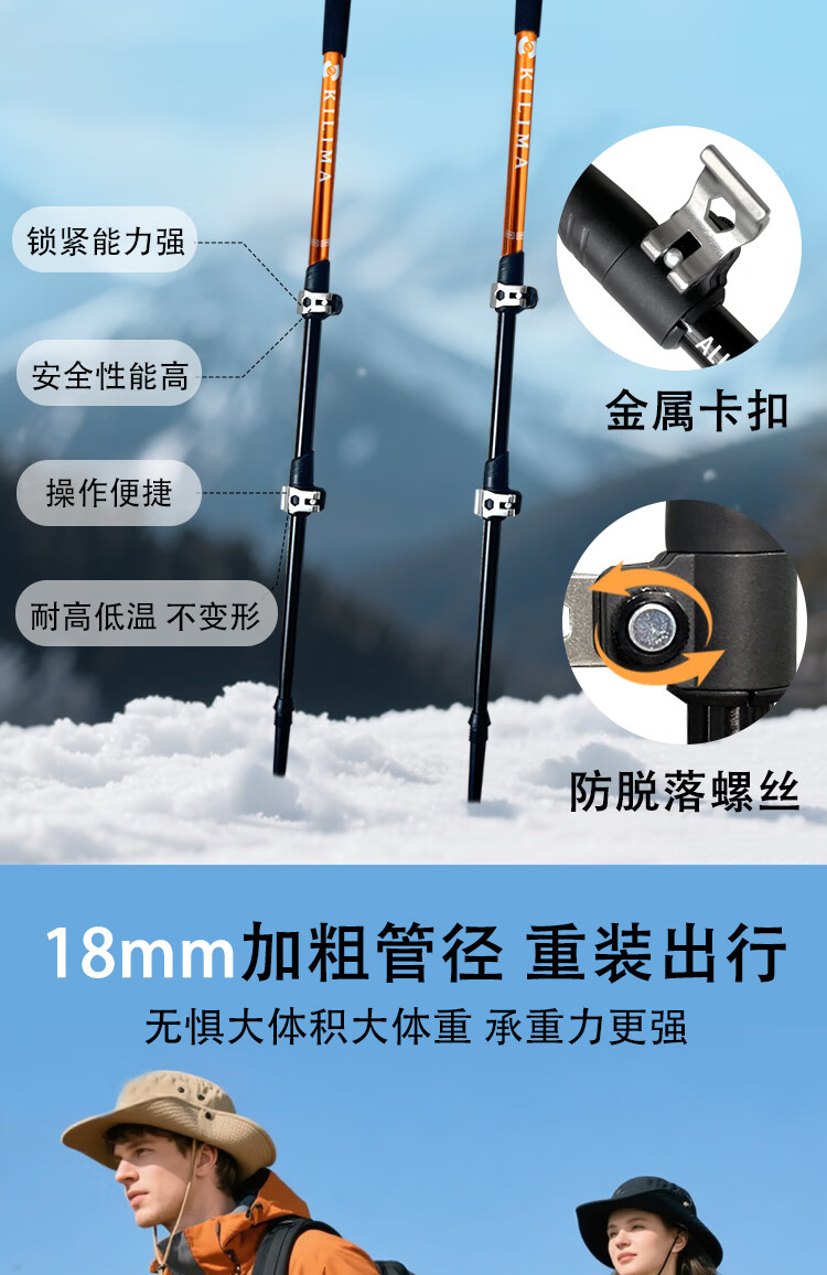 KILIMA登山杖重装金属伸缩款软木男女雪山徒步便携装备拐杖户外 L06亮橘色一根