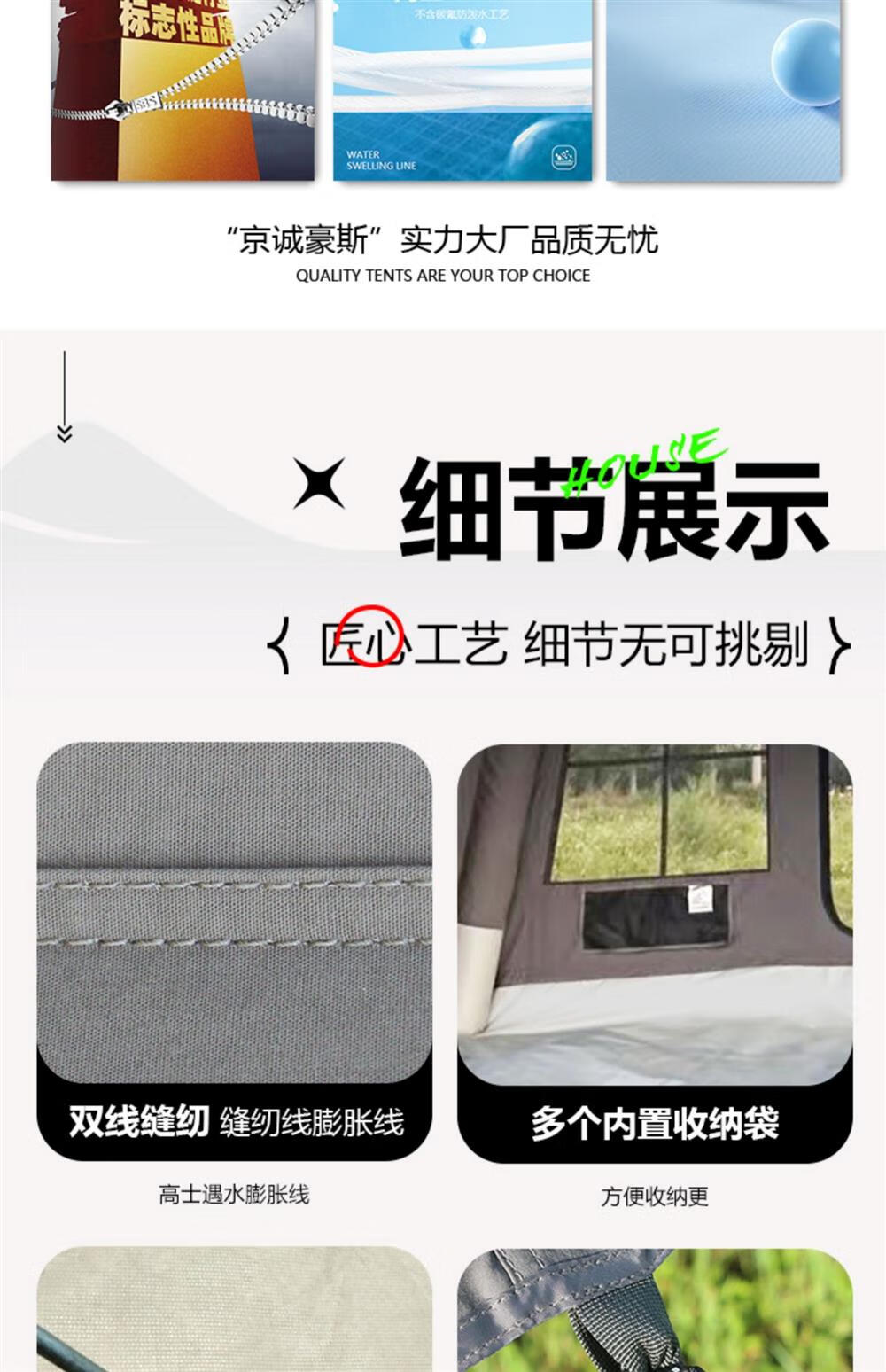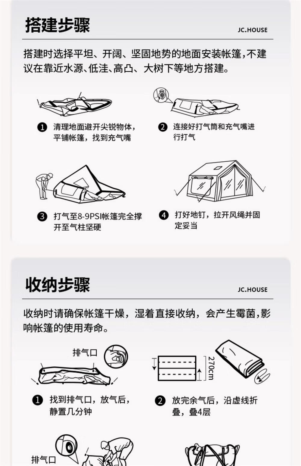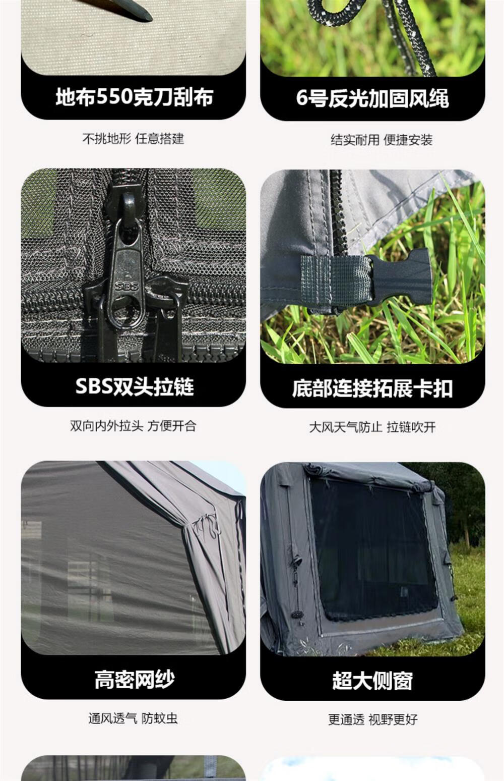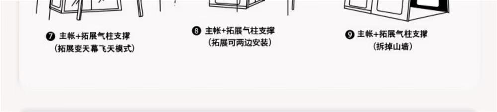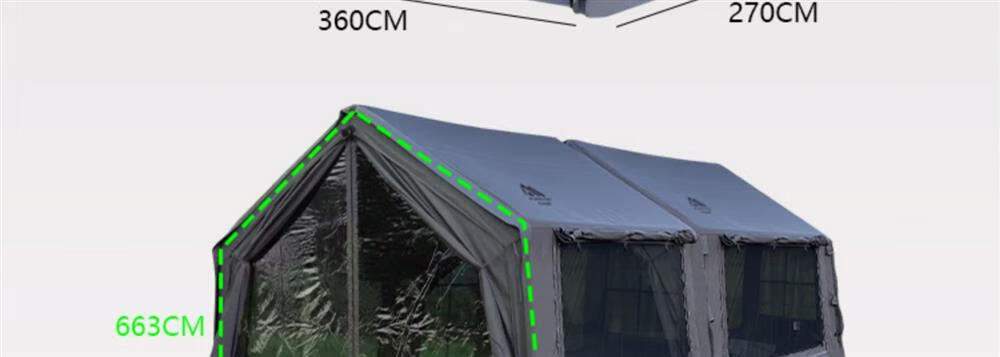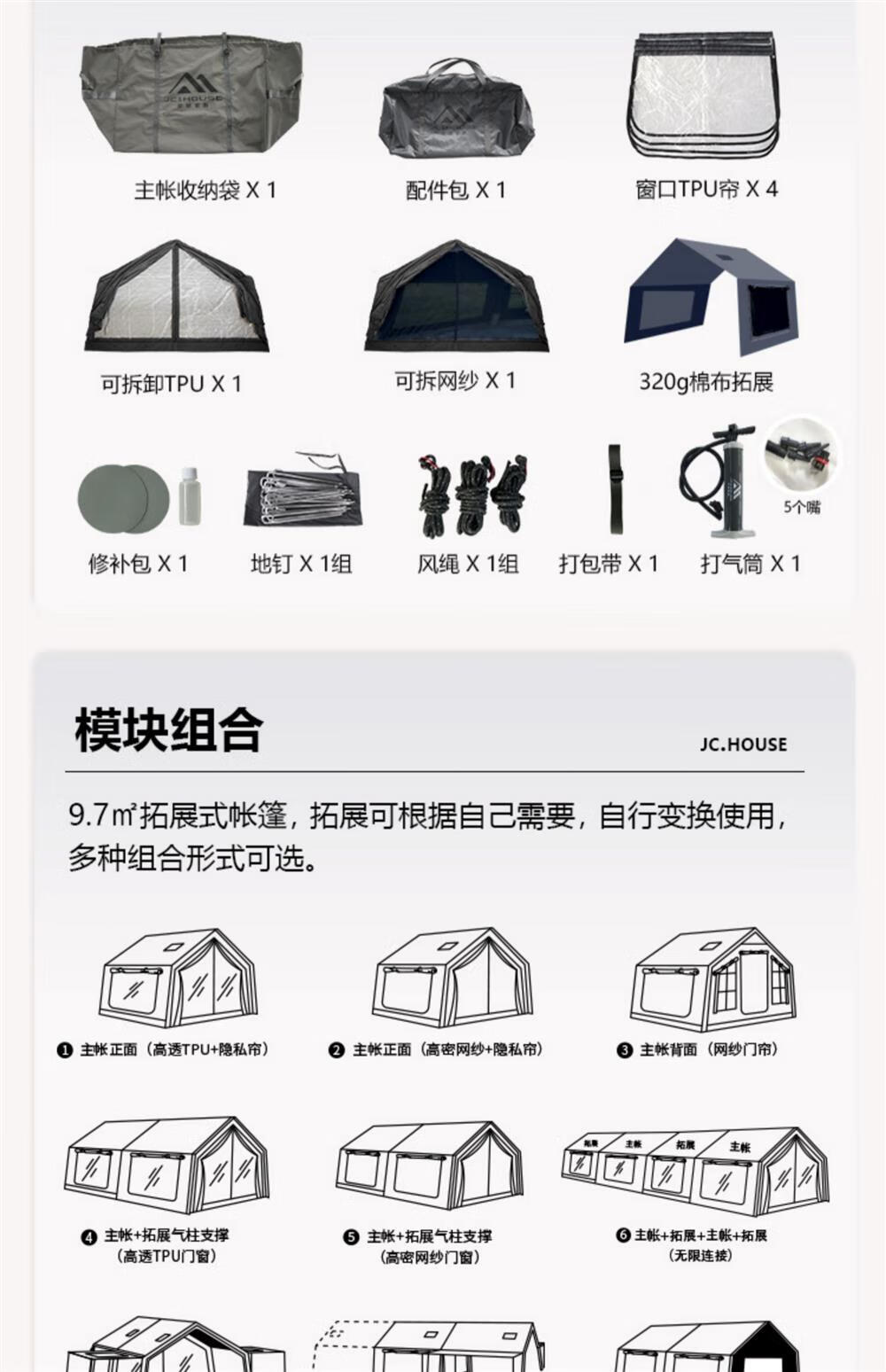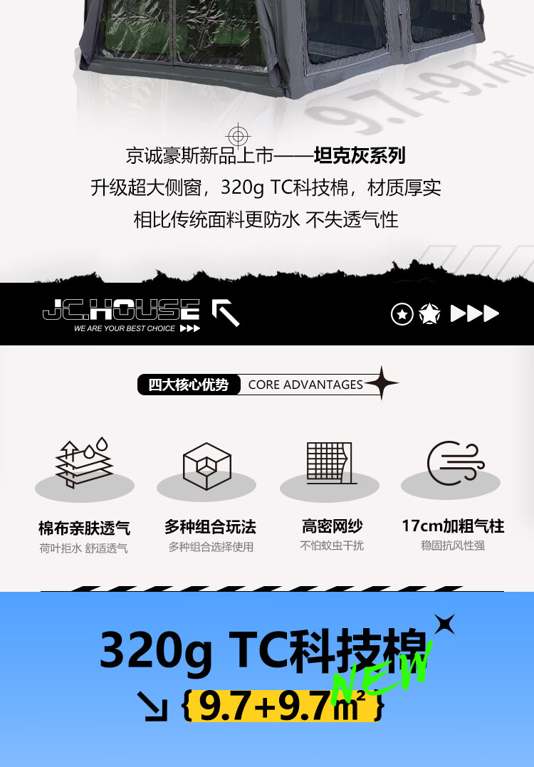 京诚豪斯JcHouse19.4㎡(9.7+9.7㎡)坦克灰320g棉布充气帐篷屋脊帐 豪斯9.7+9.7(拓展雨披) 3-5人