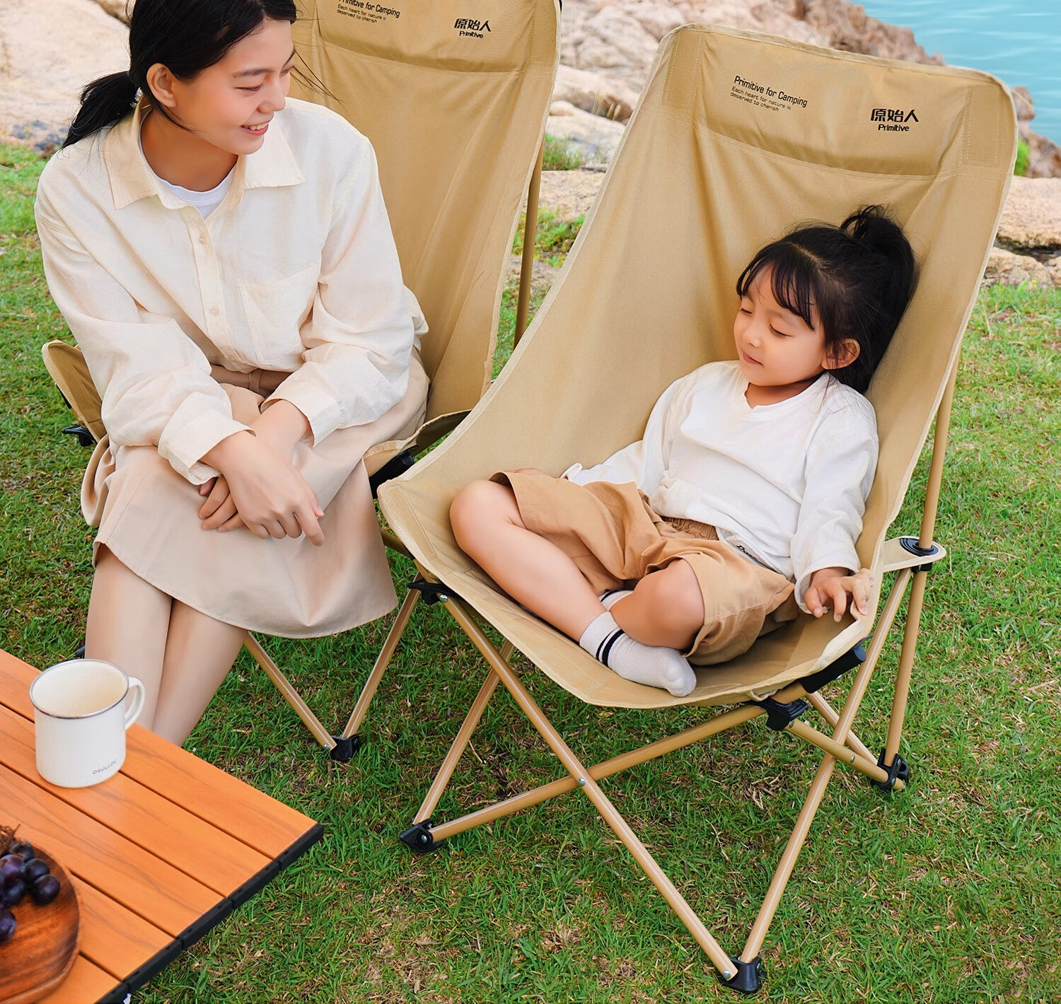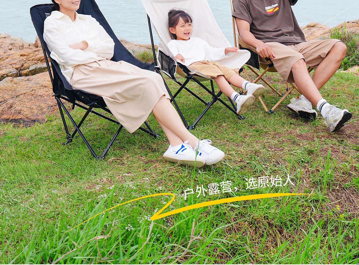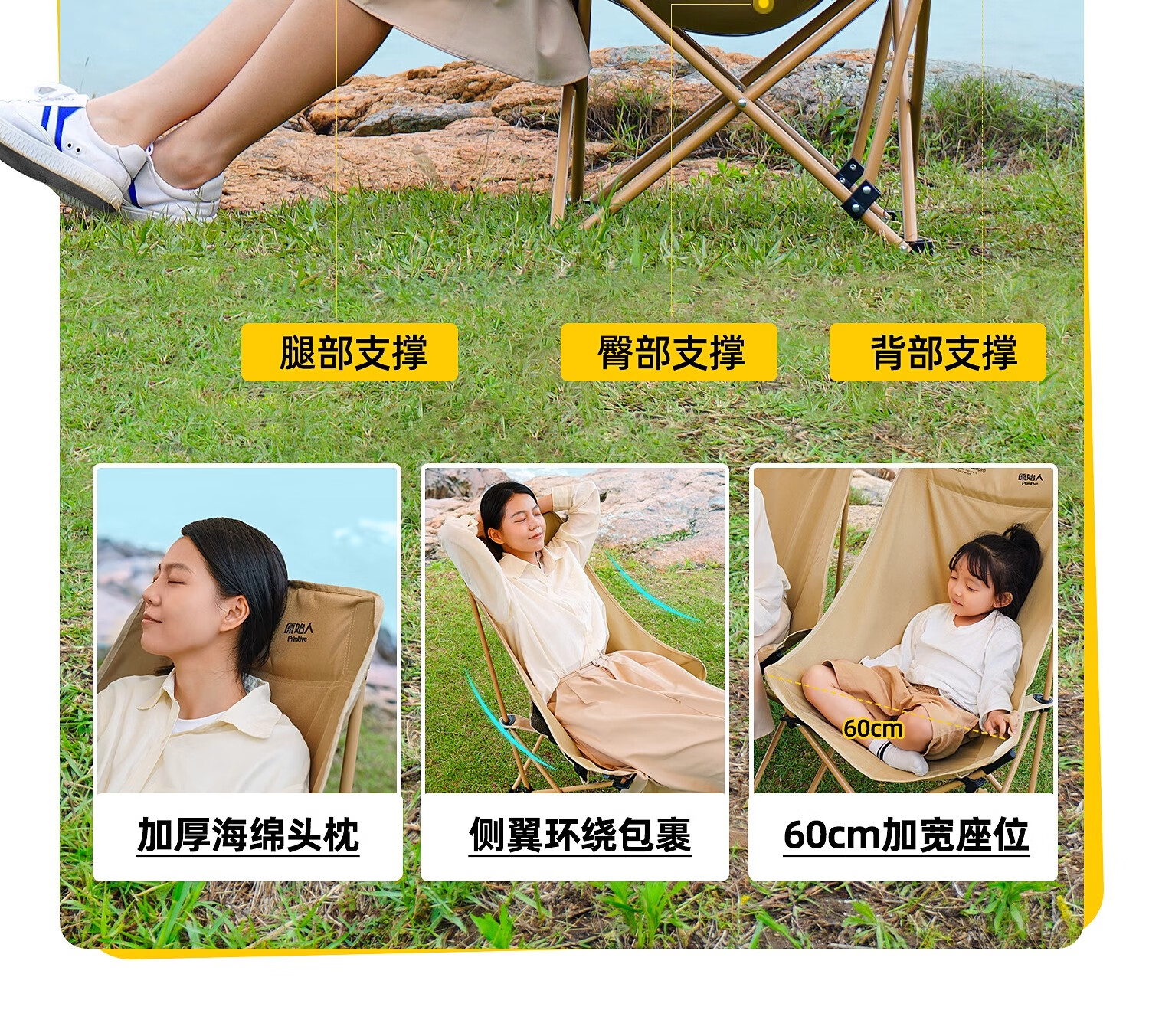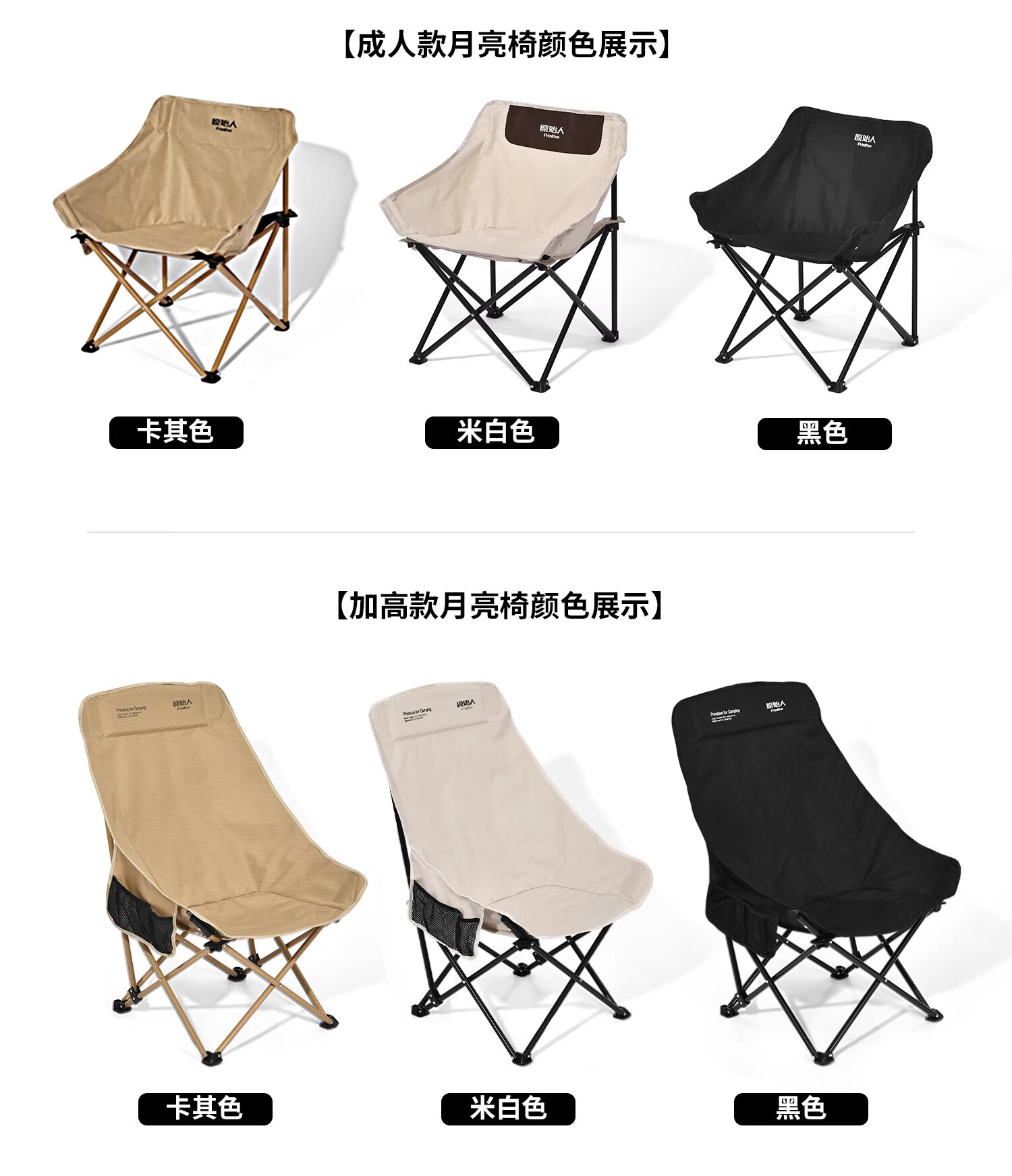 原始人户外折叠椅月亮椅露营折叠椅子便携式躺椅沙滩钓鱼椅凳野餐桌椅 经典款加高黑色-五层夹棉