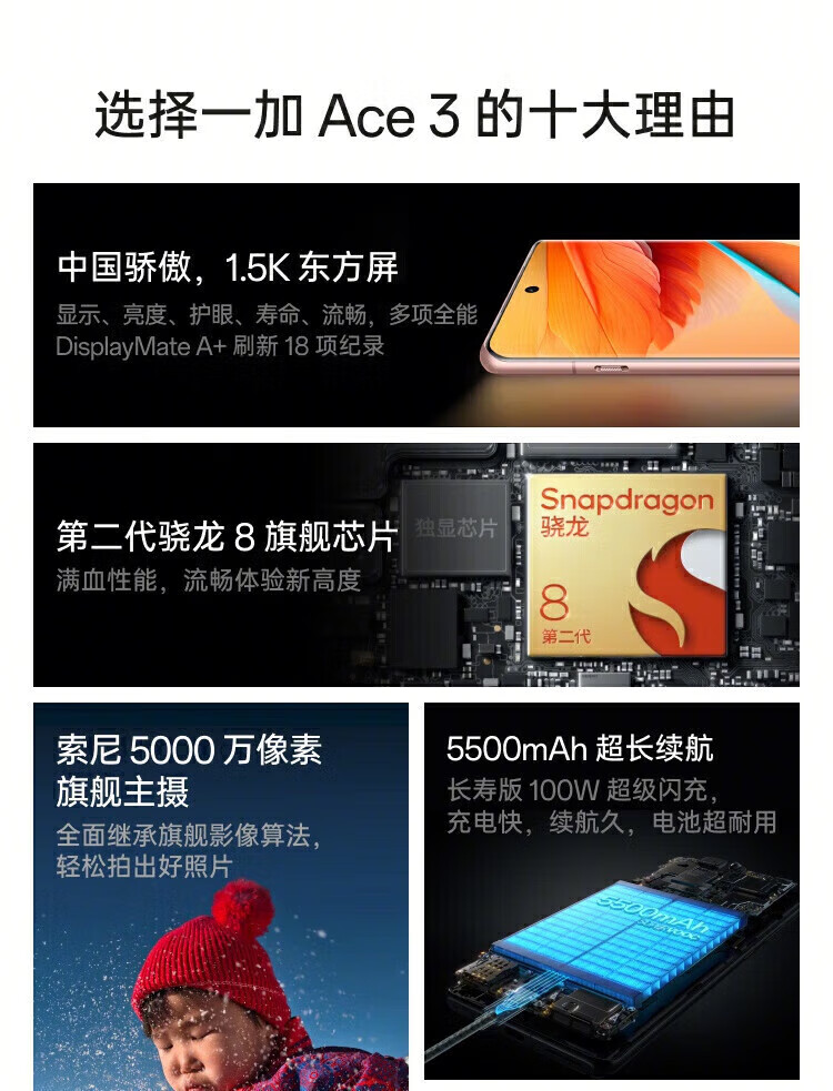 一加Ace3 旗舰平台游戏手机 1.5K东方屏电竞手机 第二代满血骁龙8 星辰黑 12GB+256GB 单机+第三方品牌充电器+店保1年