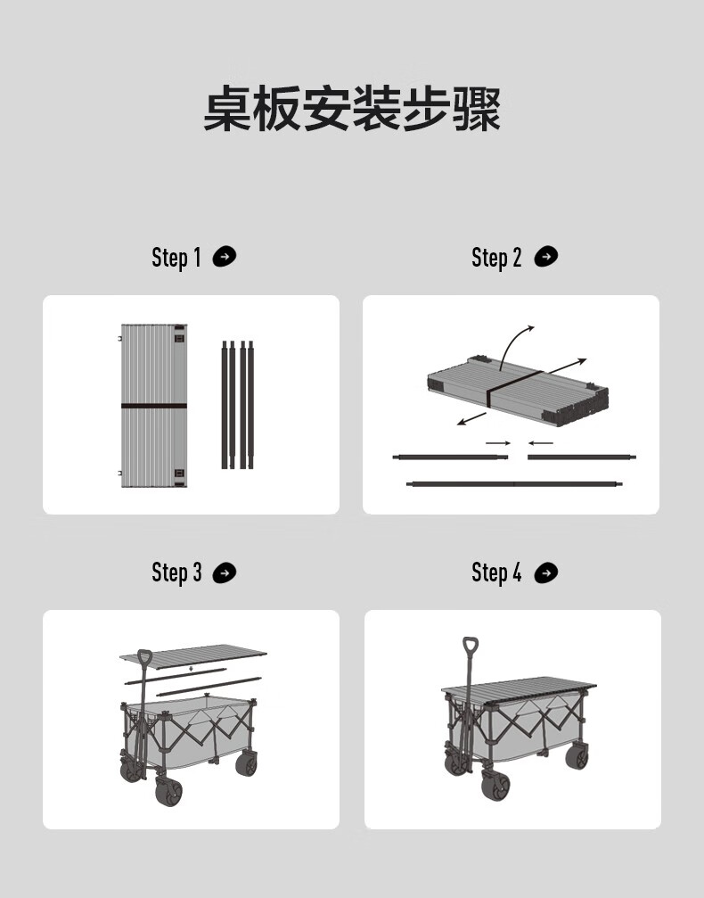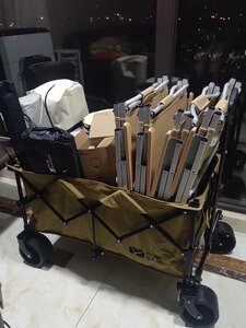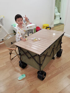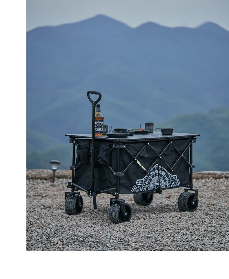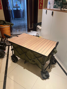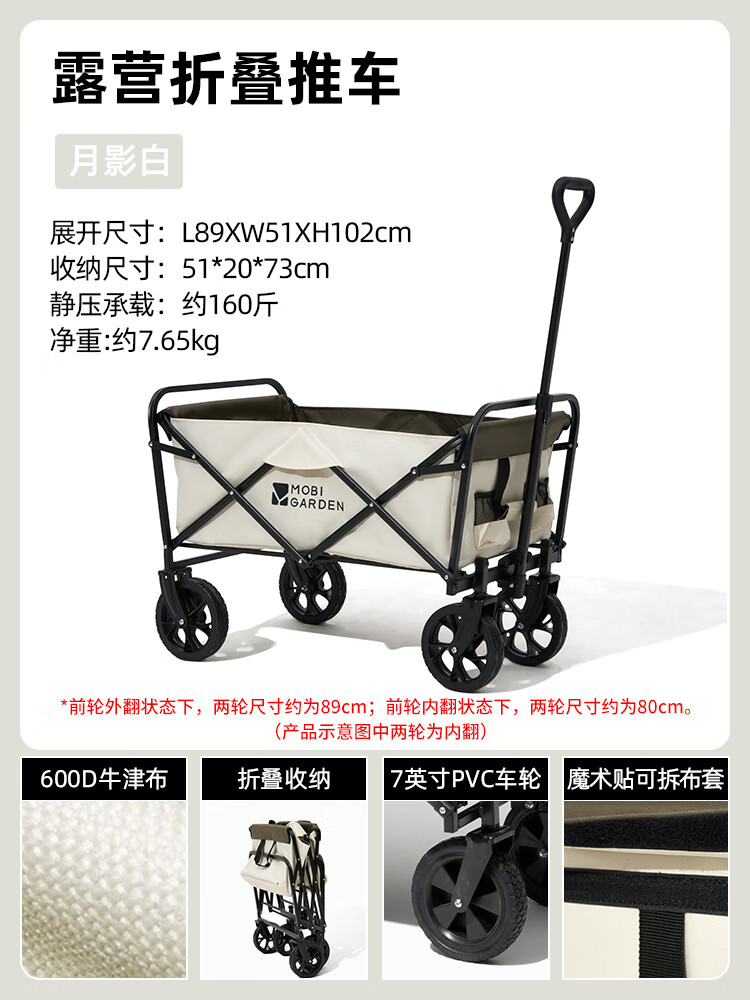 牧高迪这款大容量(190升)营地车能容下4张牧高迪克米特大号高背椅,天慕(520x450x240),排骨桌(120x60),带桌板折叠整理箱(50升),煮茶的炉具,烧水壶,茶具等等,还选配了营地车的桌板,也可做桌子用,很符合我的需求,100升的太小,轻便,但放不了什么。质量很好,很满意!想问问,为什么只有两前轮360度,不是4轮360度?