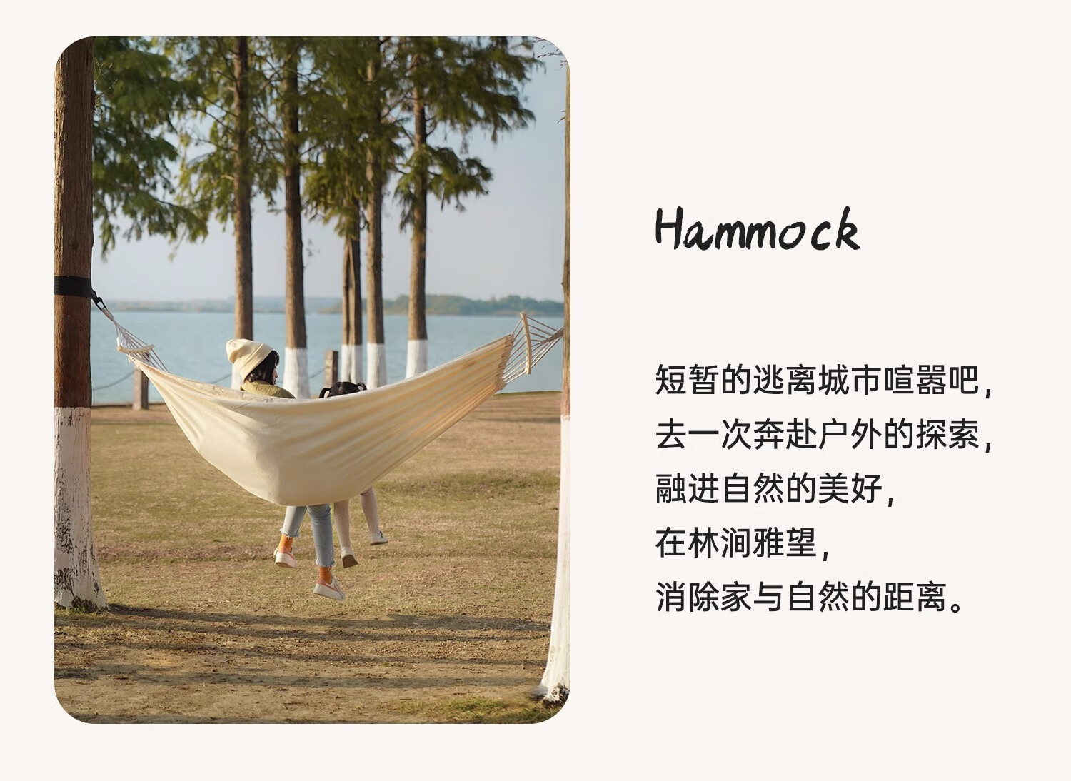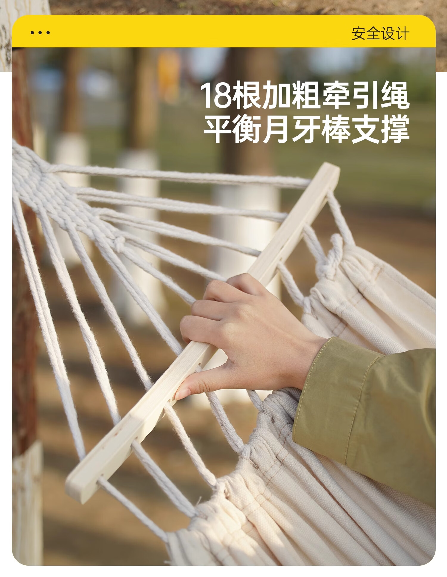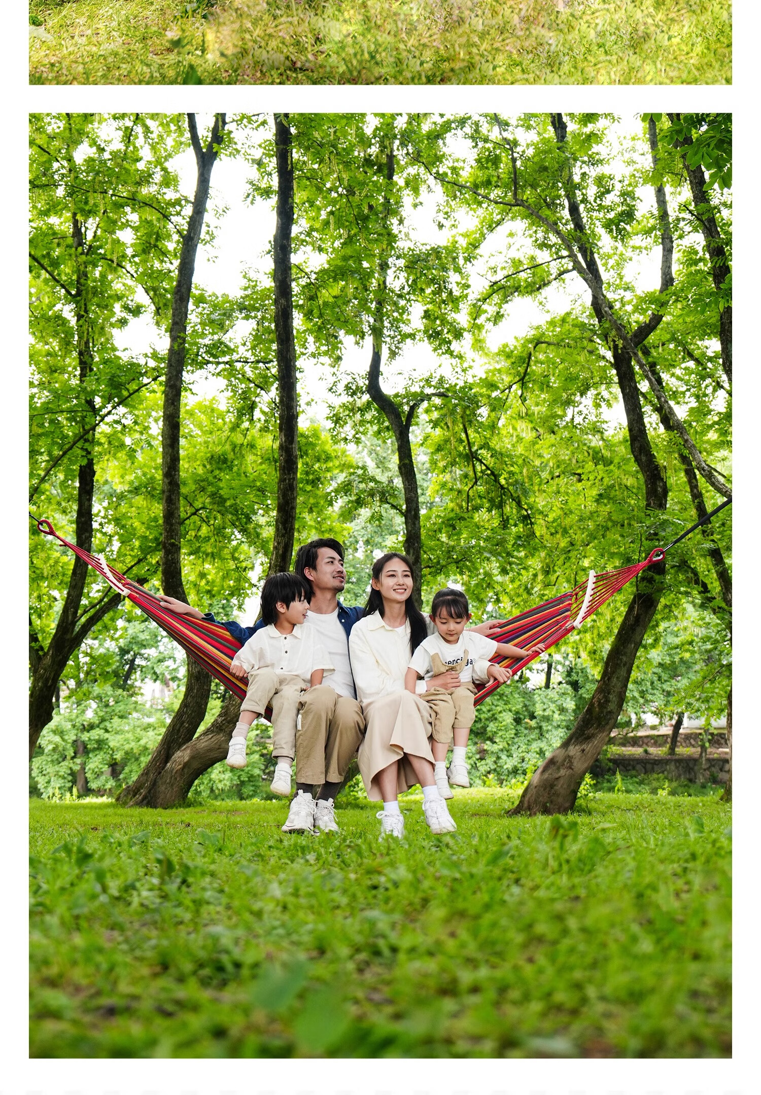 之前买过一个双人位的,质感好,价格划算,趁618再囤一个,这下两个娃就不用挤在一起了,吊床真的超级推荐,主打户外舒服又不闷热,我是户外装备齐全,但我真的喜欢吊床多过帐篷,天气炎热帐篷里面闷热的很,但是吊床更加体验大自然的风!上次大宝发高烧,不想让他在家躺着,选择去户外睡吊床,没一会了精神状态都好多了!
