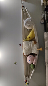 来吧,这个吊床是被我的奇异的思维方式,开发成了这样的一种艺术品。因为作为调床本身呢嗯它的作用的话呢嗯是另外一种功能。但是作为装饰也不完全是装饰,就是这些毛绒玩具的话,我感觉放在吊床上非常的棒。嗯,其实这样的话,比吊床本身的作用还是丰富不少,是非常好,非常好比我想象的还要好,你试试看👀