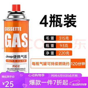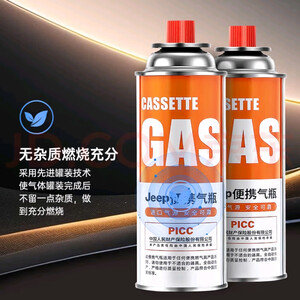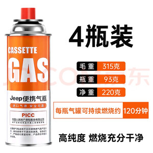 JEEP便携气瓶4瓶装,220g高纯度进口气源,燃烧120分钟持久稳定;高压缓冲密封设计,不漏气、不爆罐,PICC承保更安心。93g轻量化,户外野营、卡式炉秒换罐,背山走川无负担。京东正品,野炊刚需!