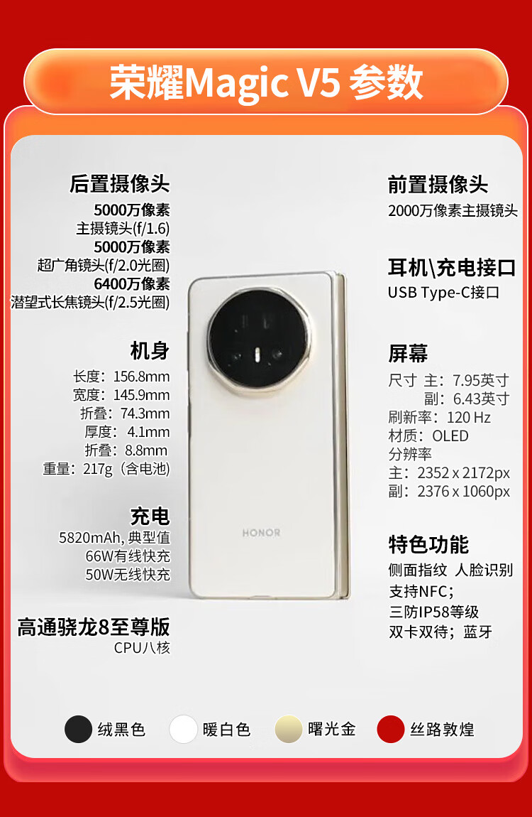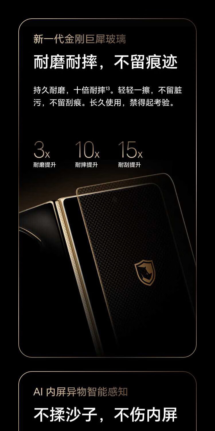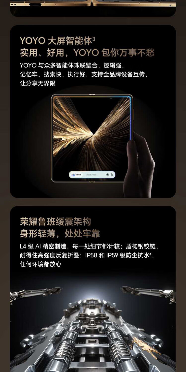 AI大模型,折叠屏,轻薄,LTPO屏幕,高频PWM调光,潜望式长焦,防水防尘,无线充电,NFC,红外遥控,磁吸无线充
