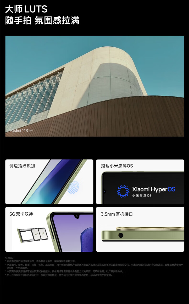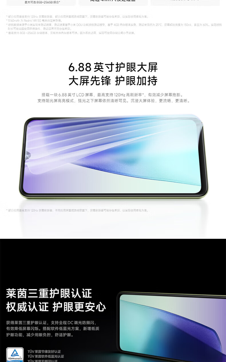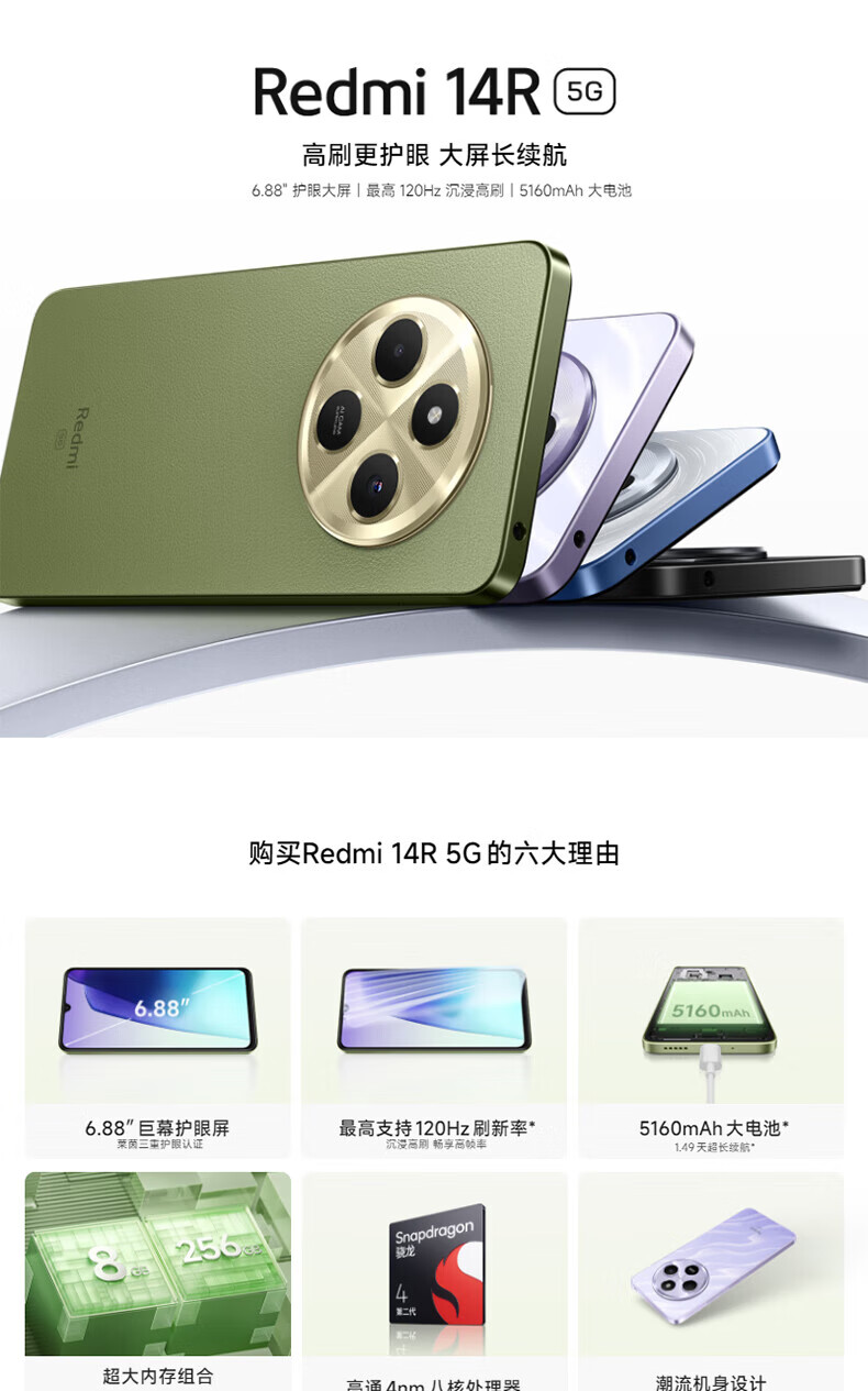小米红米14R 全网通5G手机 高通4nm八核处理器 大屏高刷长续航 老人机学生大音量 新品千元新机 暗影黑 6GB+128GB