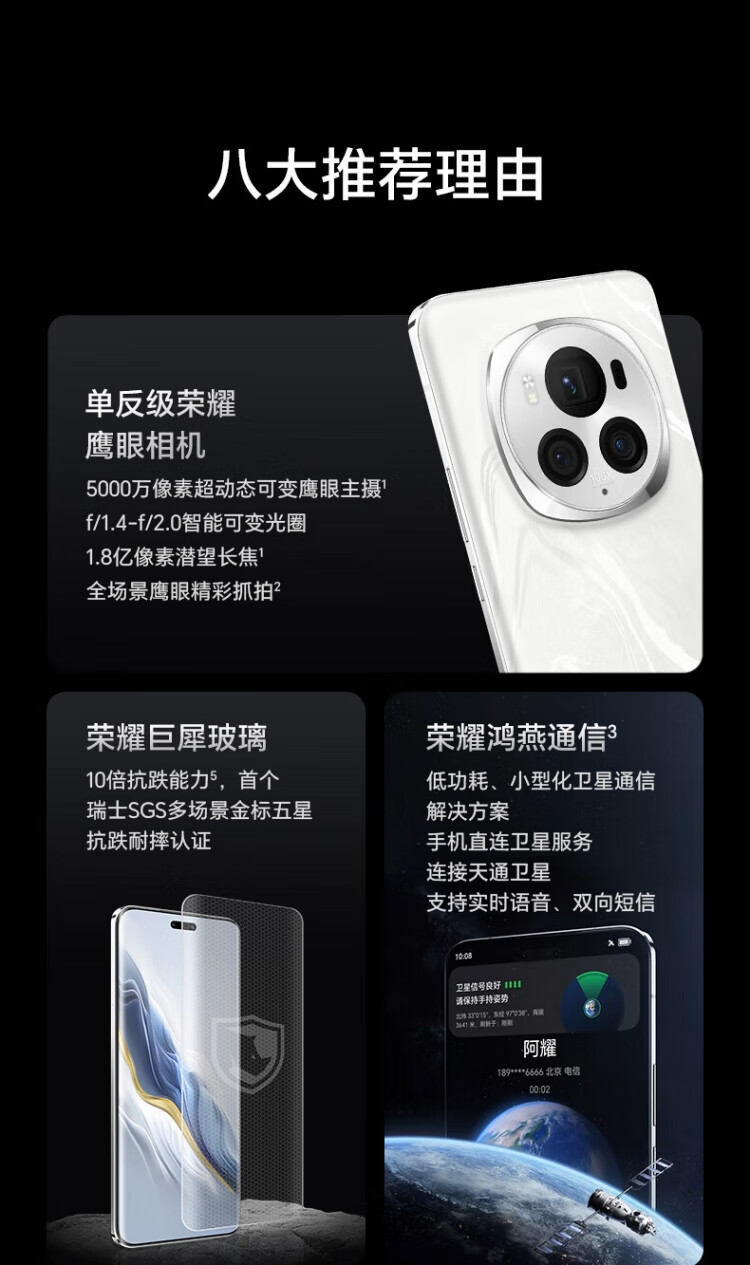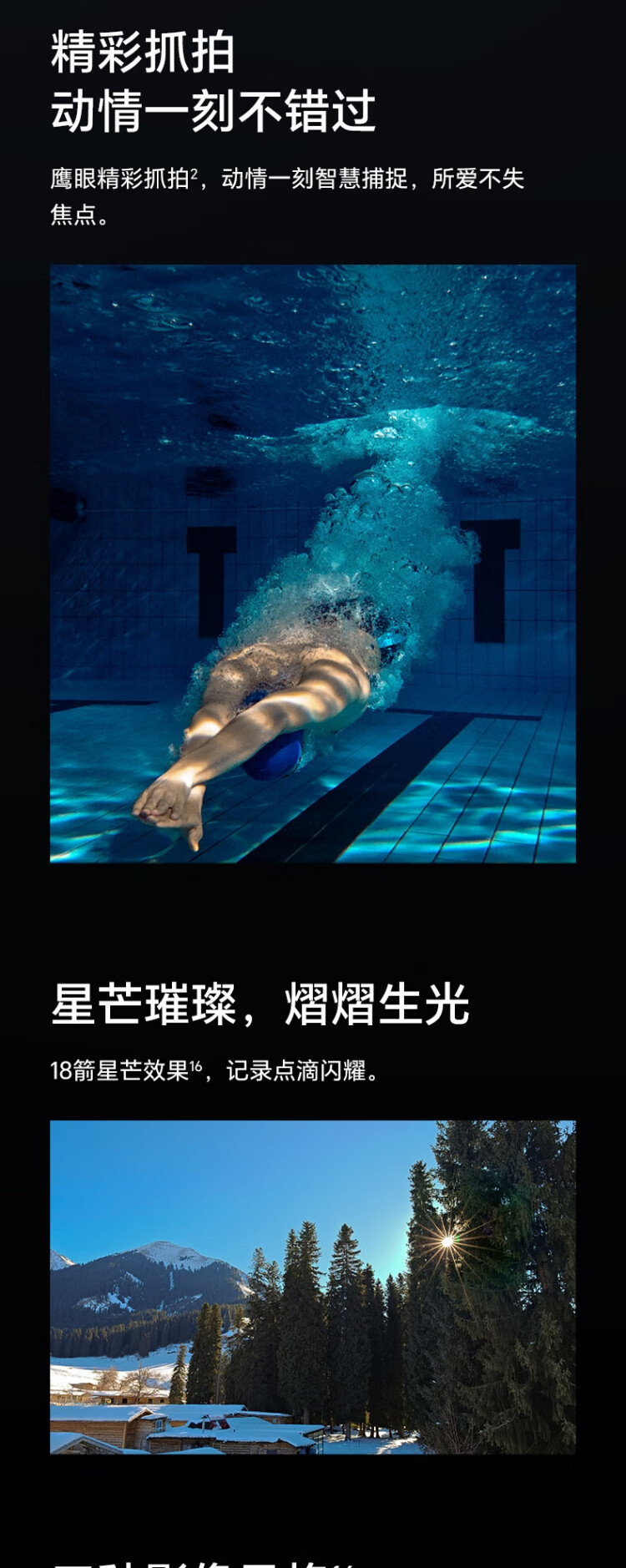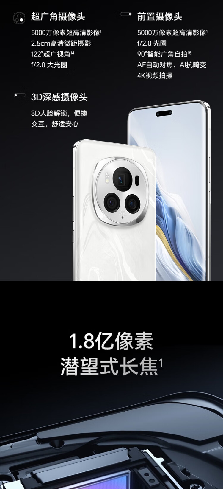 AI大模型,卫星通话,LTPO屏幕,高频PWM调光,潜望式长焦,防水防尘,无线充电,NFC,红外遥控,大底主摄