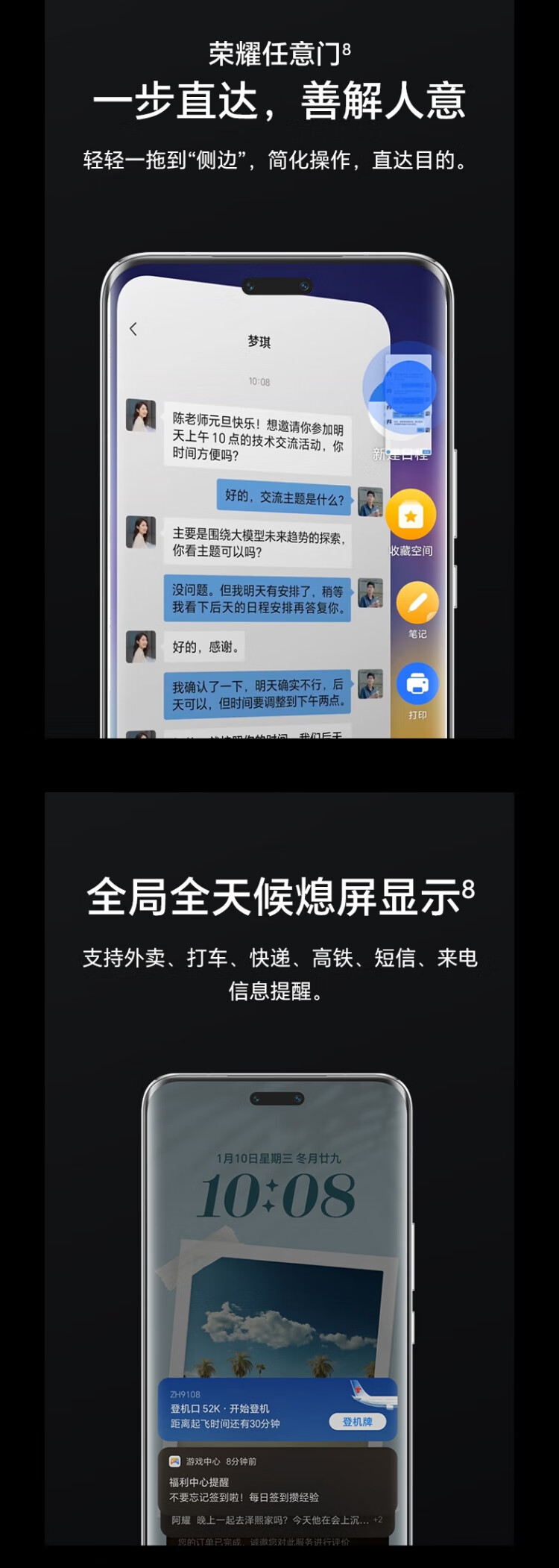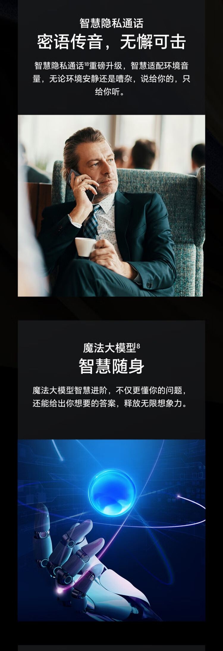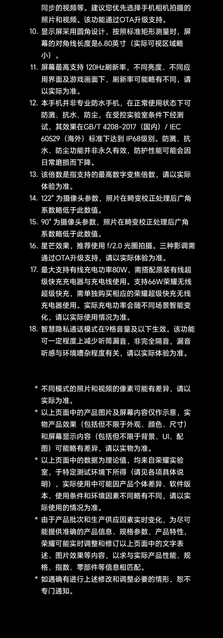 AI大模型,卫星通话,LTPO屏幕,高频PWM调光,潜望式长焦,防水防尘,无线充电,NFC,红外遥控,大底主摄