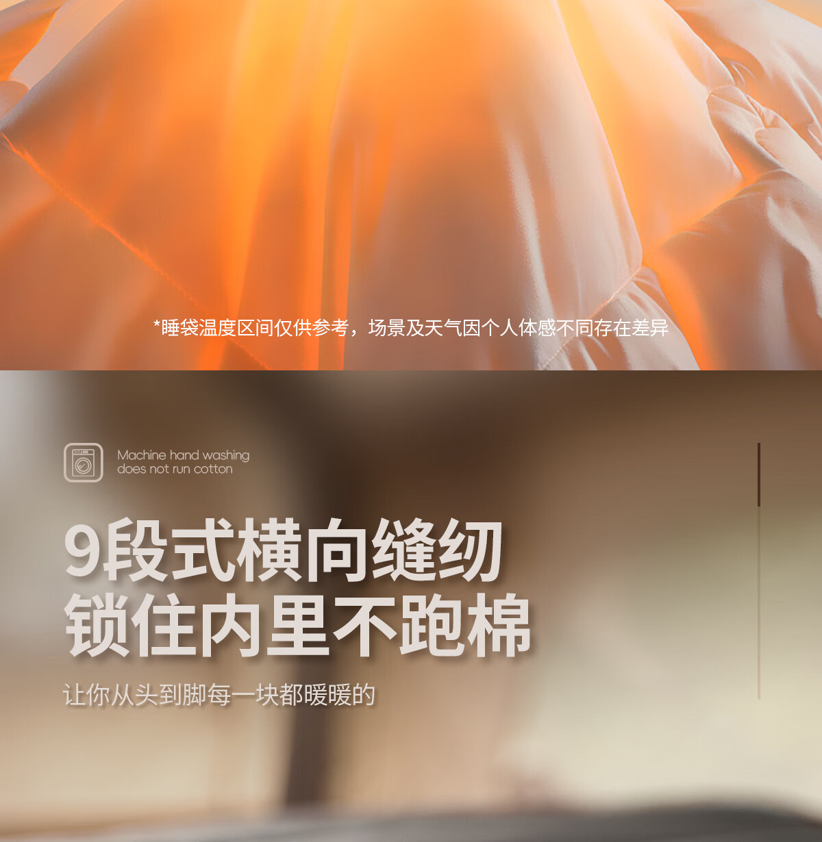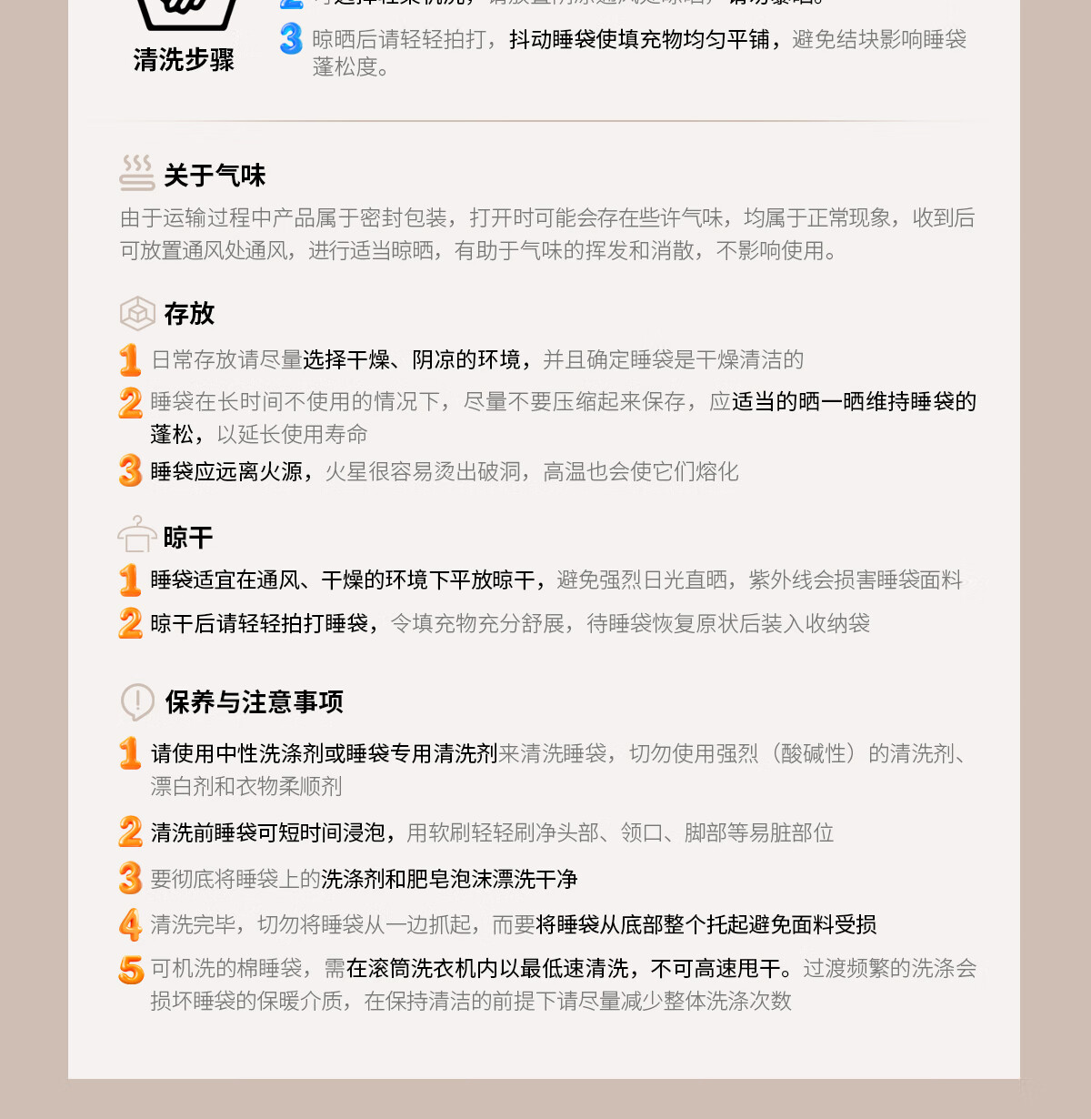 睡袋长短合适,尺寸宽敞,填充厚实,但是不知道具体是什么材质,御寒能力咋样目前由于还没使用过还不得而知,后期追评,味道很大,晾晒了差不多6.7天了还是一股很大气味,目前发现三处需要改善,1,头顶处设计太短小,收缩保暖做不到,翻过来盖头也盖不住,2.脚那一头面料质量估计够呛,使用过程中脚蹬啊,拉扯啊啥的估计扛不住,开线滑丝应该是预料中的事,3.也是最不好的一点,也是最大败笔,拉链在实际使用中很不友好,每一次都会夹住面料铰进拉链里边去,应该进行锁边处理或者像上边一样布条压边处理,好了就说这么多,过几天跑一趟高速夜里使用后再来评价实际使用体验…