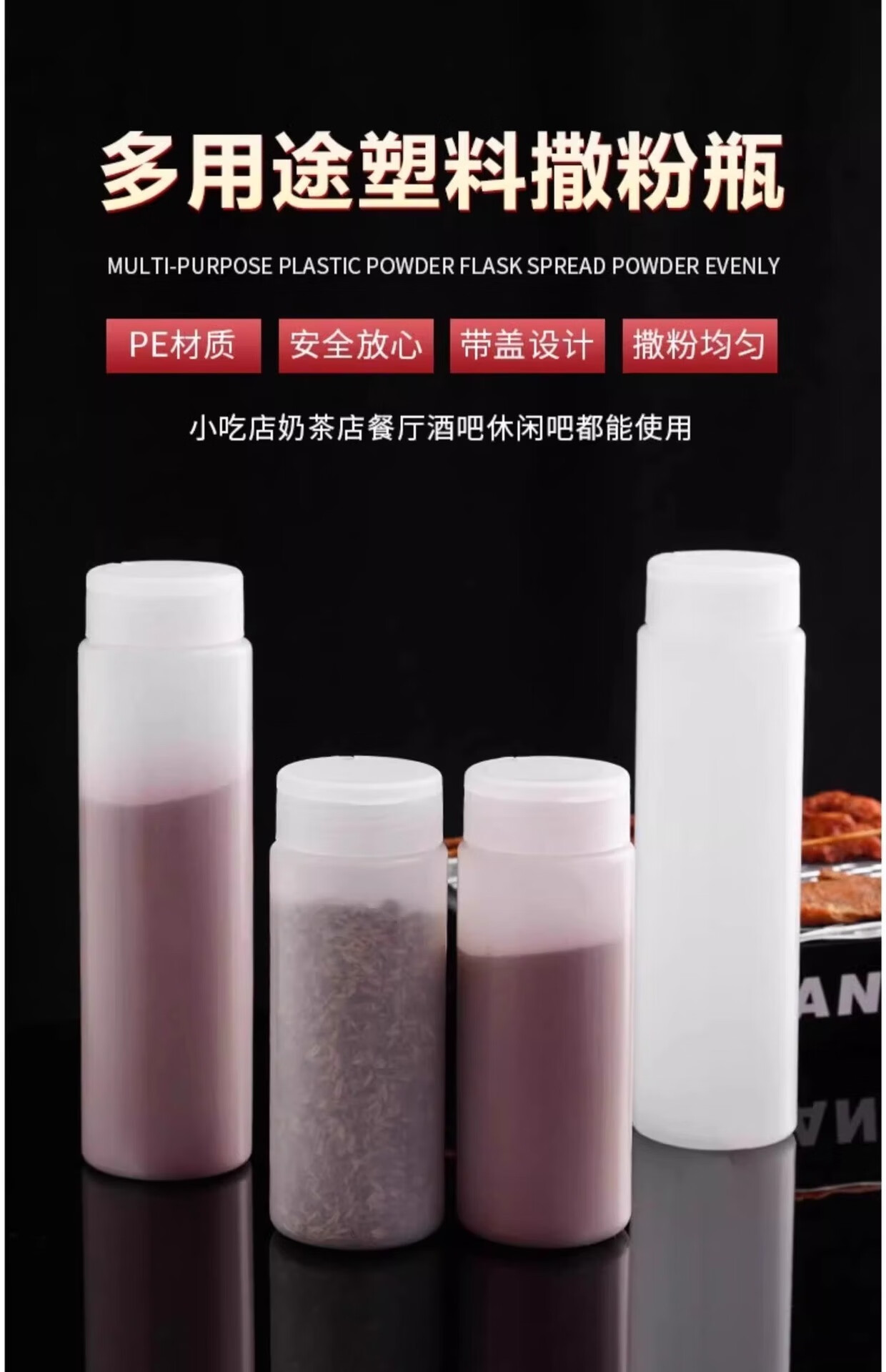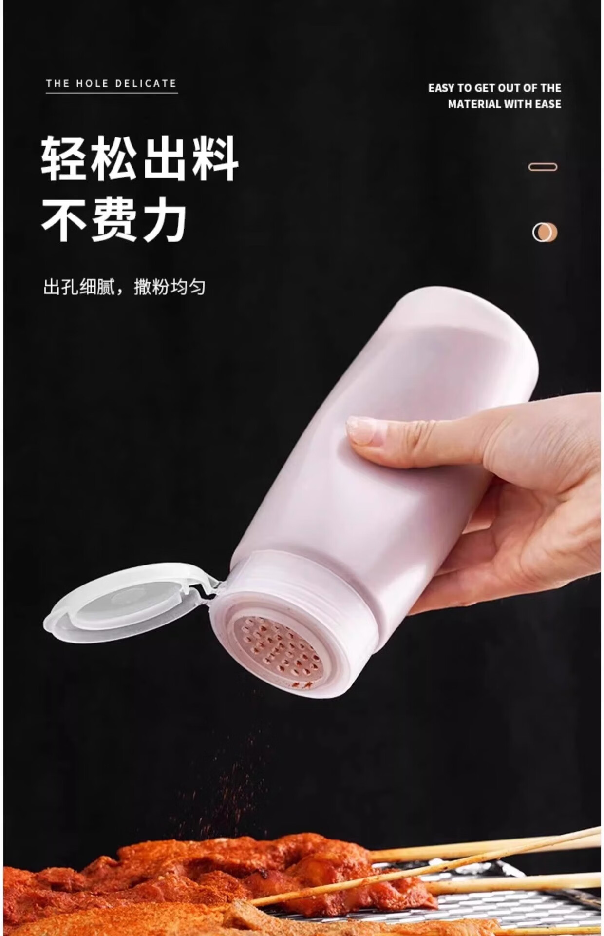 旋转盖设计真的很方便,撒粉均匀不结块,户外烧烤用了几次都没漏,清洗也简单。价格实惠,性价比高。