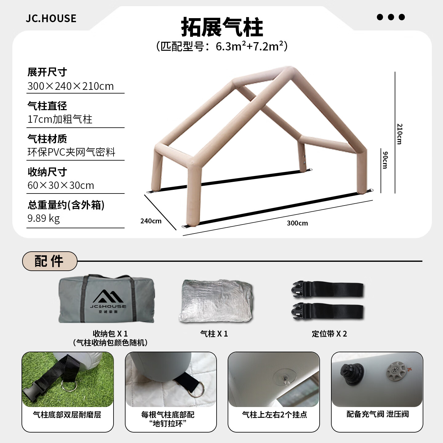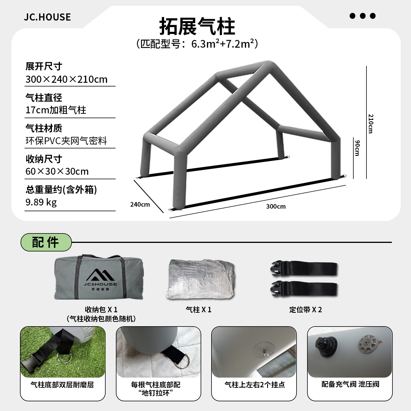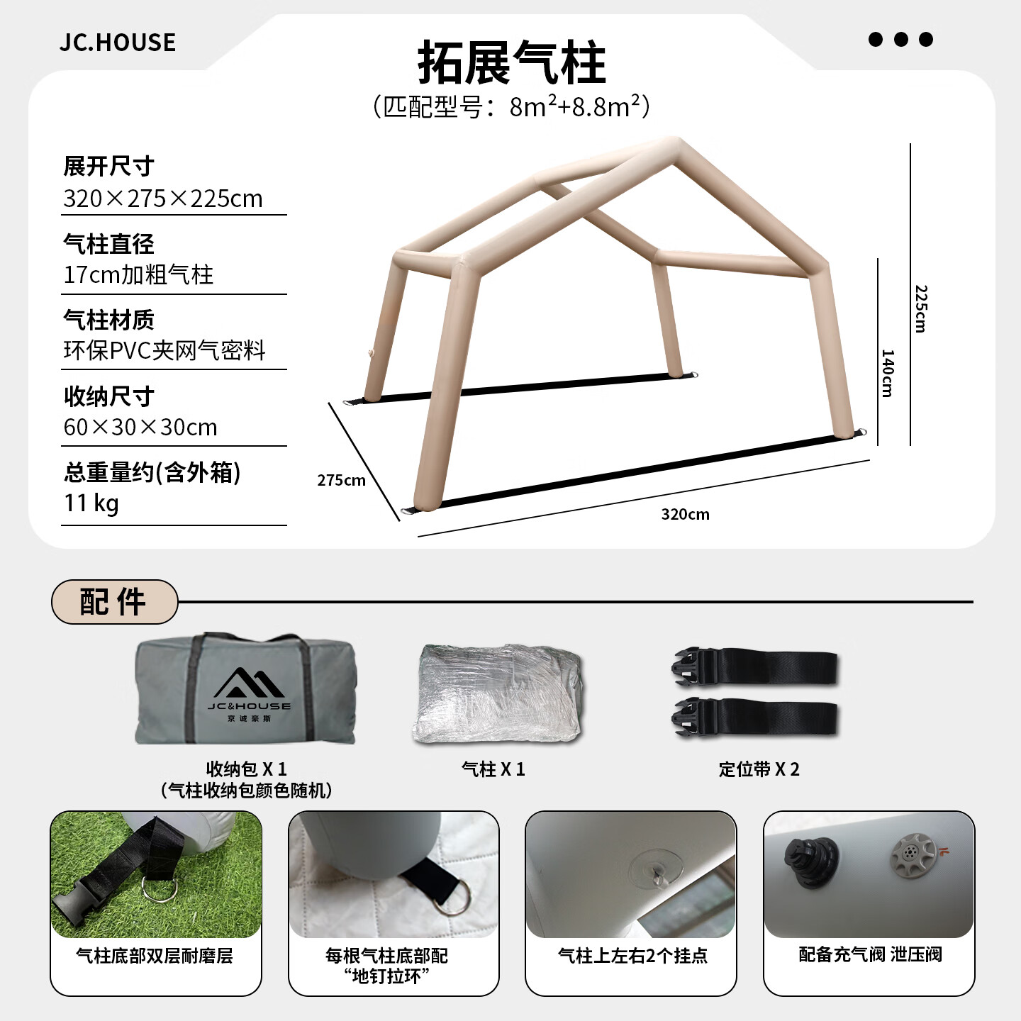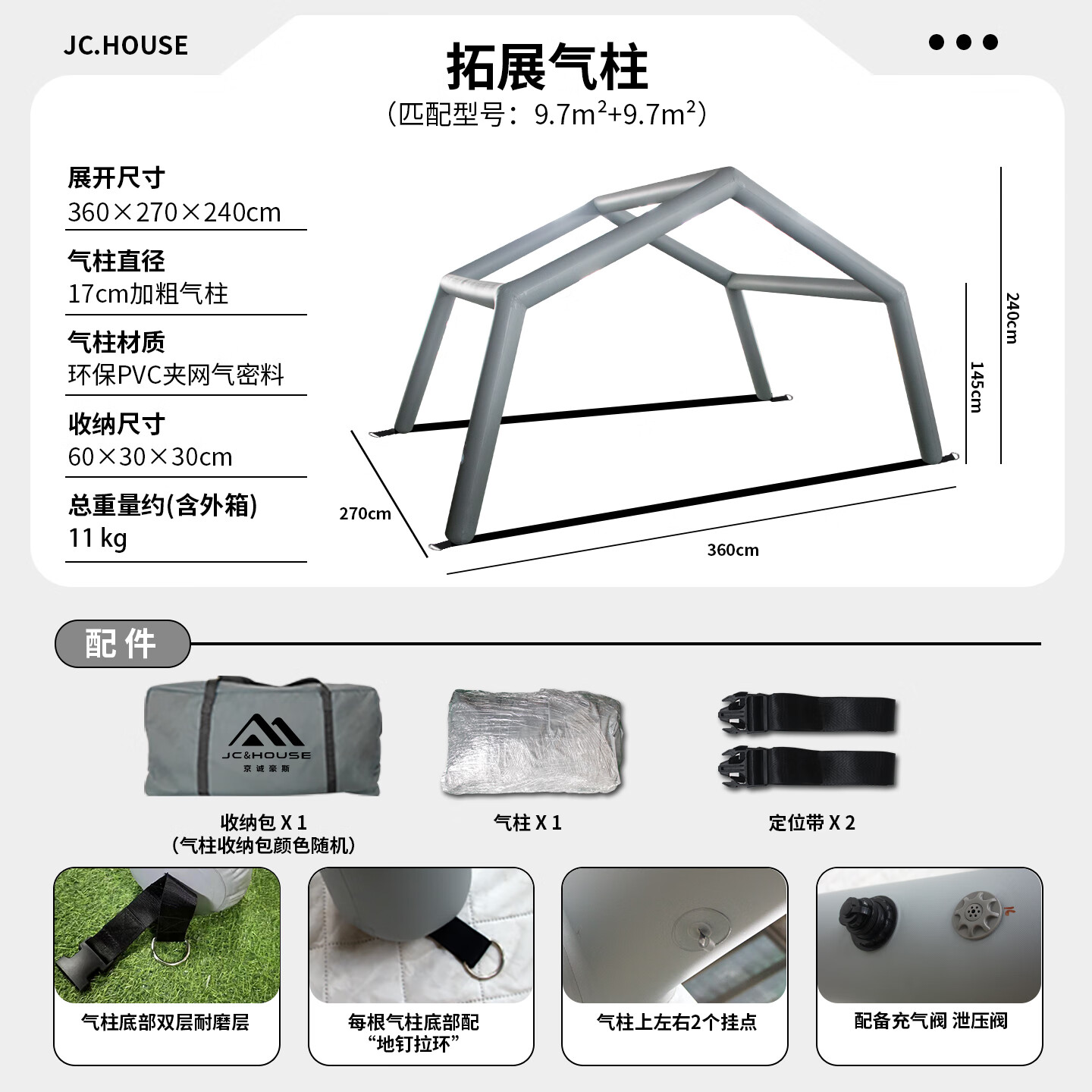 京诚豪斯JcHouse充气帐篷门厅拓展气柱PVC气柱6.3㎡/8+8.8㎡/9.7㎡ 豪斯8+8.8 ㎡(灰色)拓展气柱(单气柱)