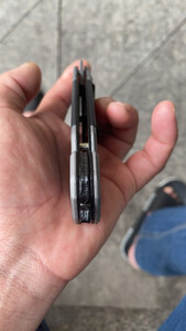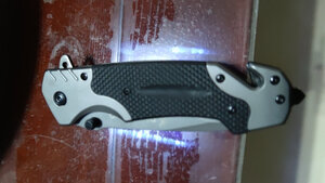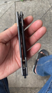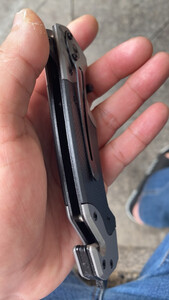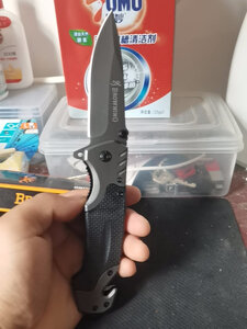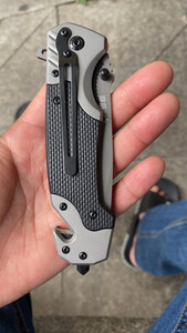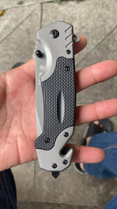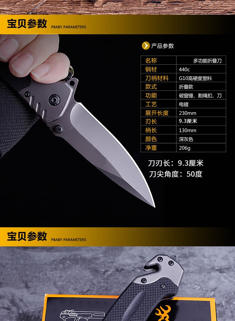 产品重量:很坠手!!感觉日常使用足够了;整件刀具没有任何松动的地方,刀刃已开锋; 产品材质:不懂,可能是什么钢吧,买来玩的,买小把点,原来也买过一把,弹簧刀,太大把的,一把大匕首。。 适合人群:打开包装,看到一把手枪图案,心里不知这个是啥?!打开看到是刀,很快打开了,居然关不上了,我玩刀多年,居然会合不上了。。。纸盒也没个说明啥的,我研究了一分钟,终于用指甲一扣,刀刃合上了。此刀,不是弹簧刀!!玩了会,基本满意,质量应该没什么问题,二十六块拍到的,觉得该商品很划算!!