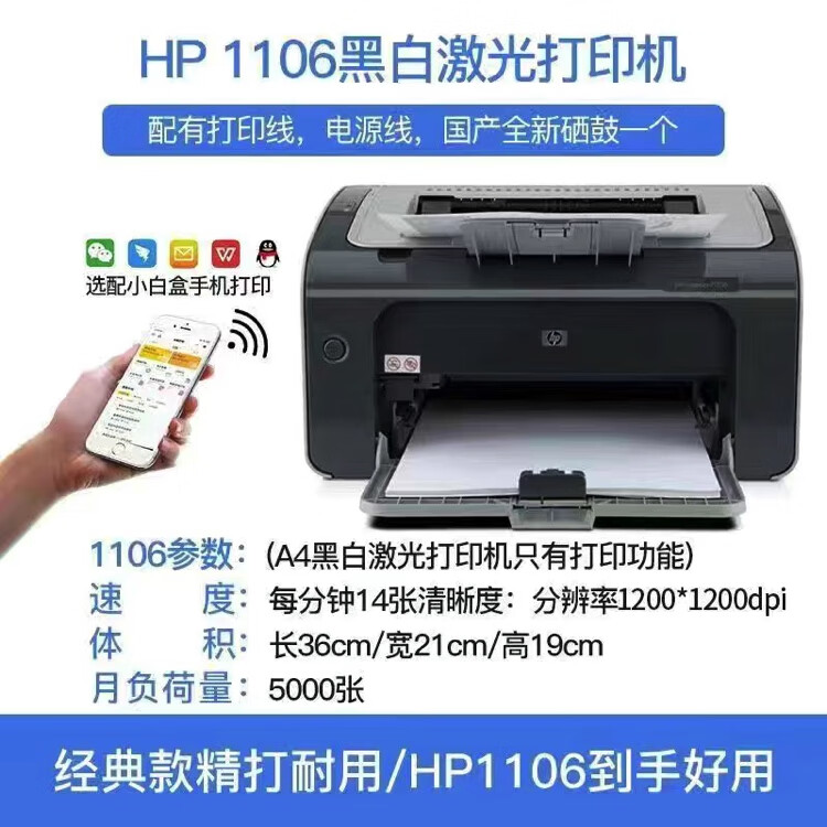 HP惠普P1108/1106黑白激光打印机小型办公商用学生家用财务凭证A4 1106带小白盒(手机打印)