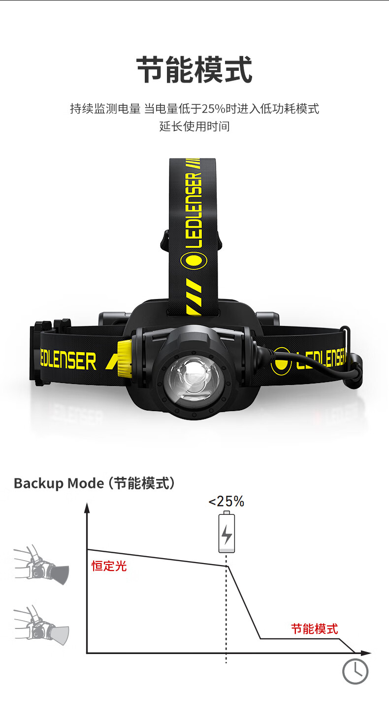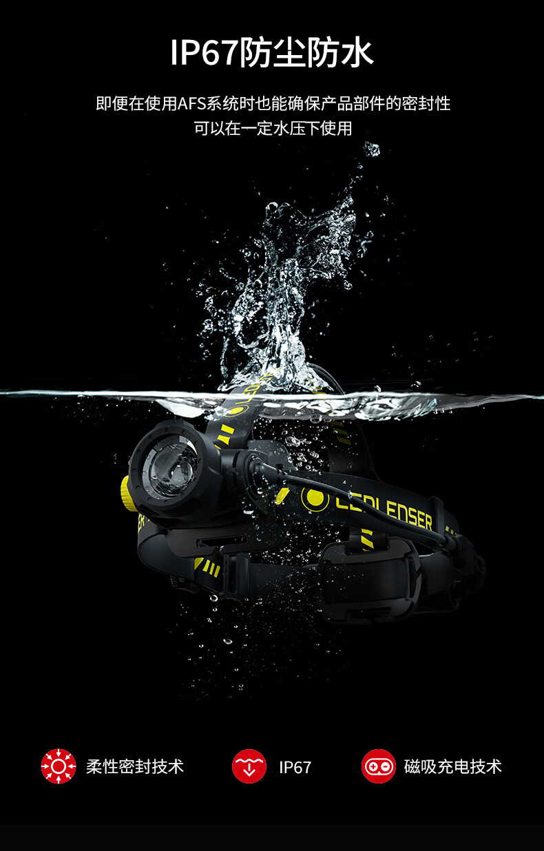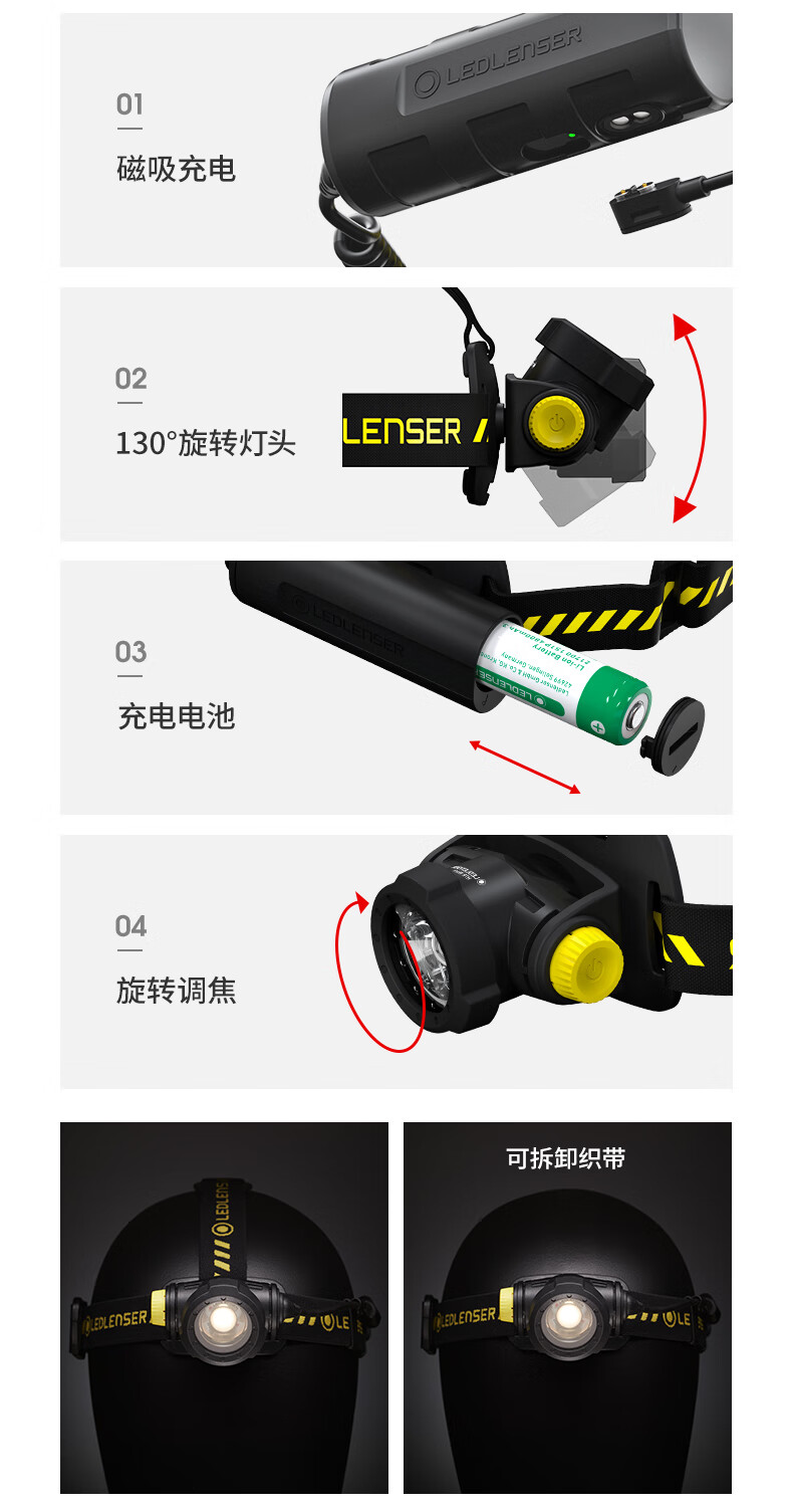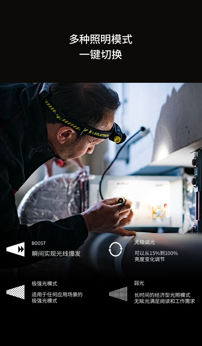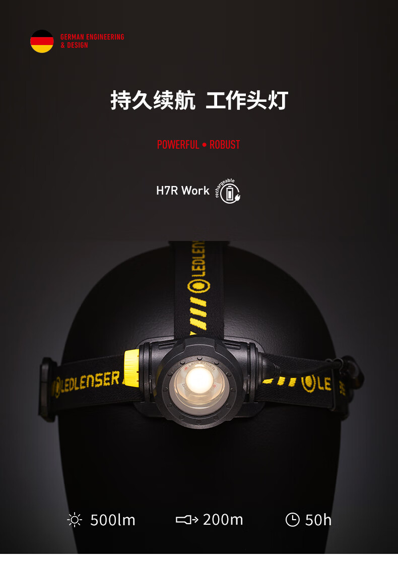 莱德雷神(LED LENSER)H7R Work工作头灯强光充电超亮夜钓超长续航头戴式黄光灯 黑色 WORK 专业版【黄光】